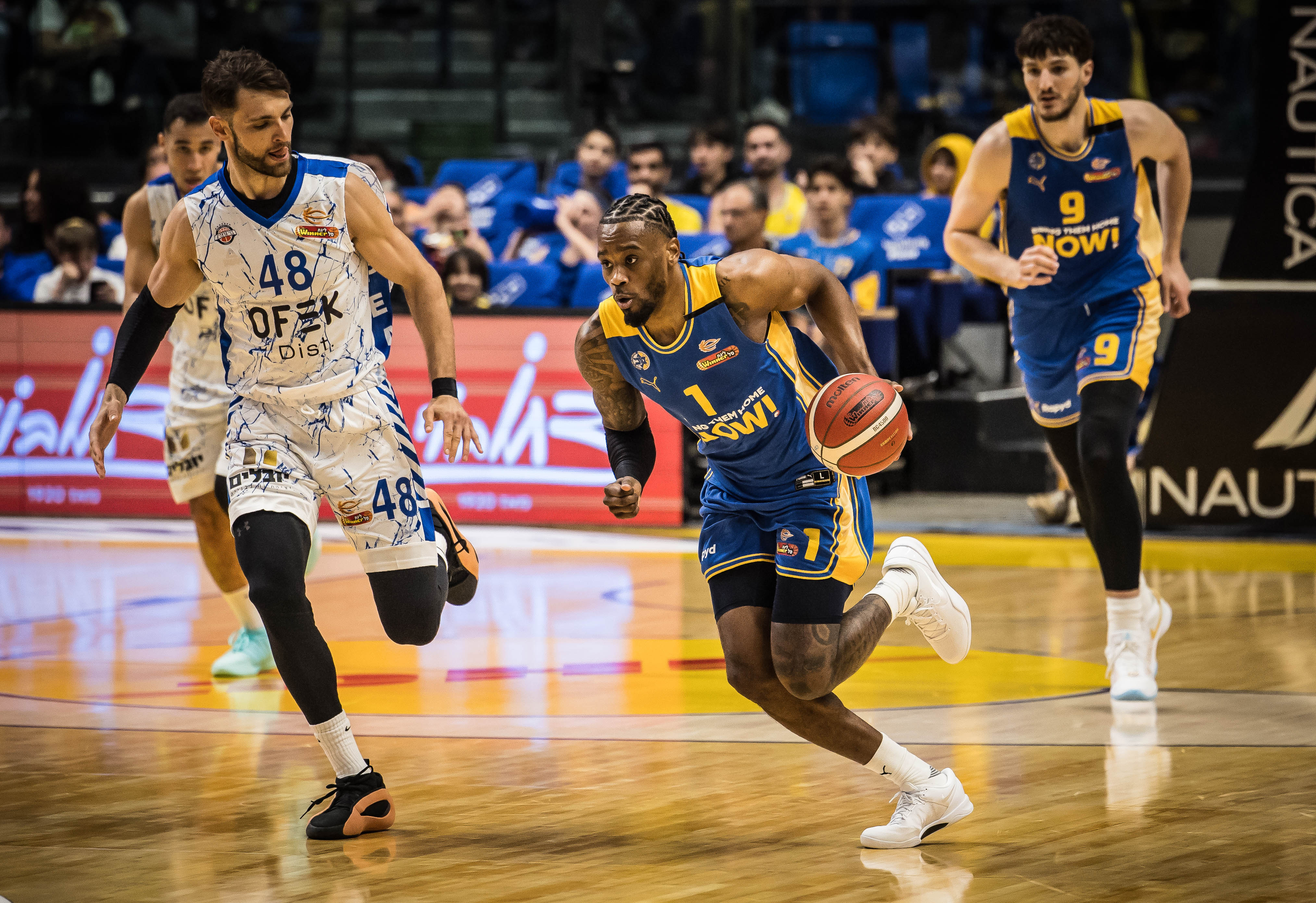 מכבי "Playtika" תל אביב קלעה 62 נקודות לפני ההפסקה והגדילה את הפער בפסגה עם ניצחונה ה-14 ברצף, 85:98 ביתי על בני "Ofek Dist" הרצליה (צילום: עודד קרני)