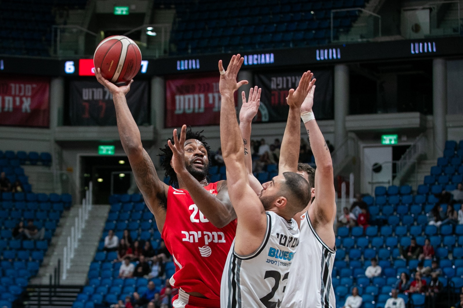 רנדולף מנסה לקלוע מעל לוטאטי וגולדנברג (צילום: אורן בן חקון, באדיבות הפועל ירושלים)