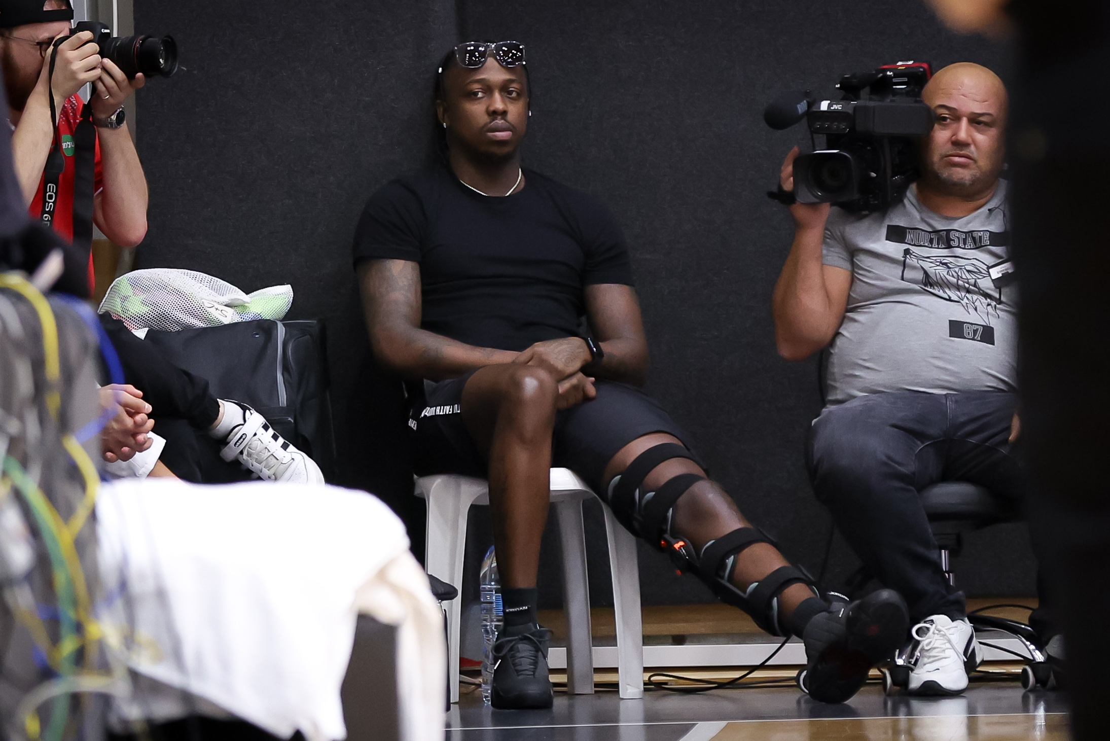 בראון הפצוע צופה בקבוצתו מהצד (צילום: מאור אלקסלסי)