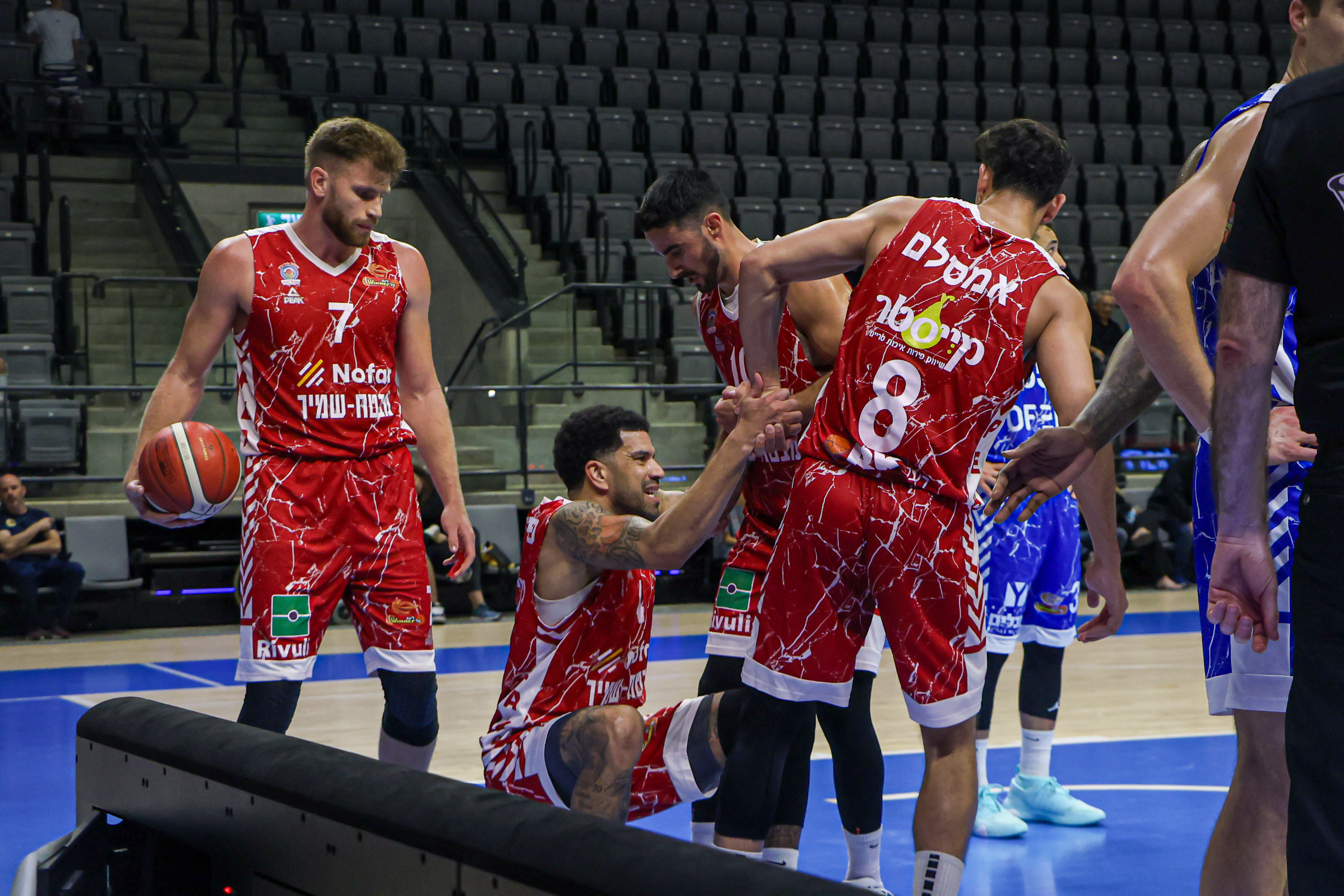 פלדין נעזר בחבריו כדי לקום. קלע שיא עונתי (צילום: אור מושקוביץ, באדיבות הפועל גליל עליון)
