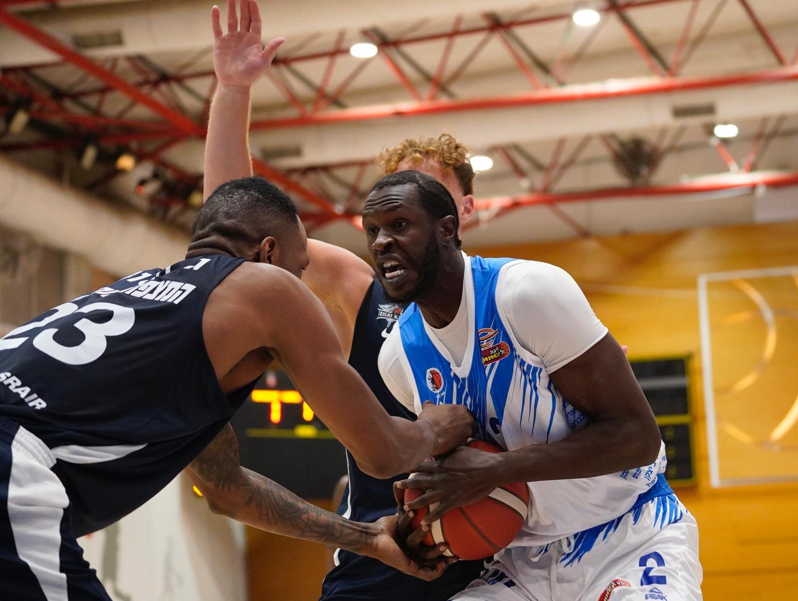 מתיאנג וג'ונסון נאבקים על הכדור (צילום: גיא ביטמן, באדיבות מכבי עירוני רמת גן)