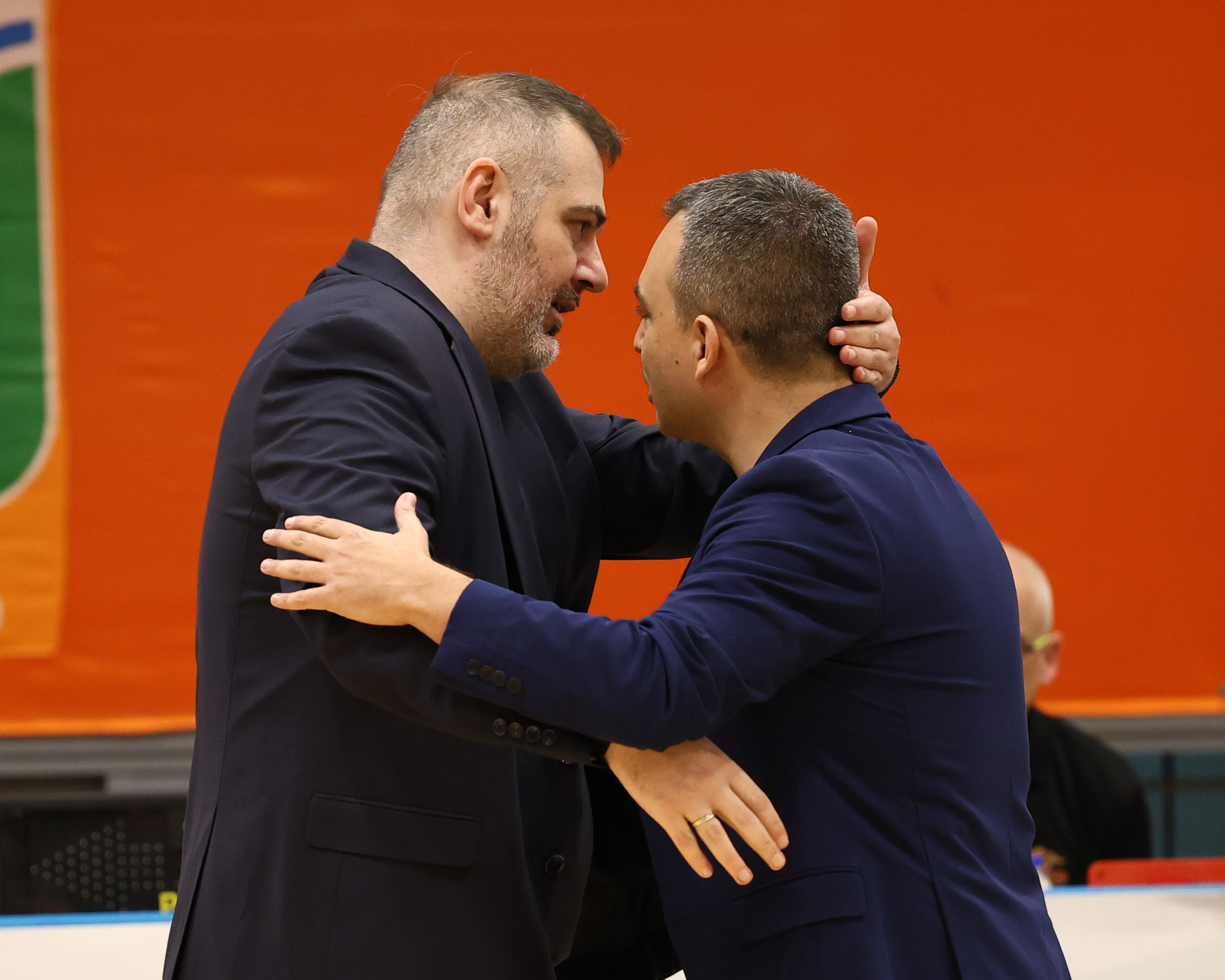 דדאס וחסין מתחבקים בפתיחה. המאמן היווני שב ארצה (צילום: דני מרון)