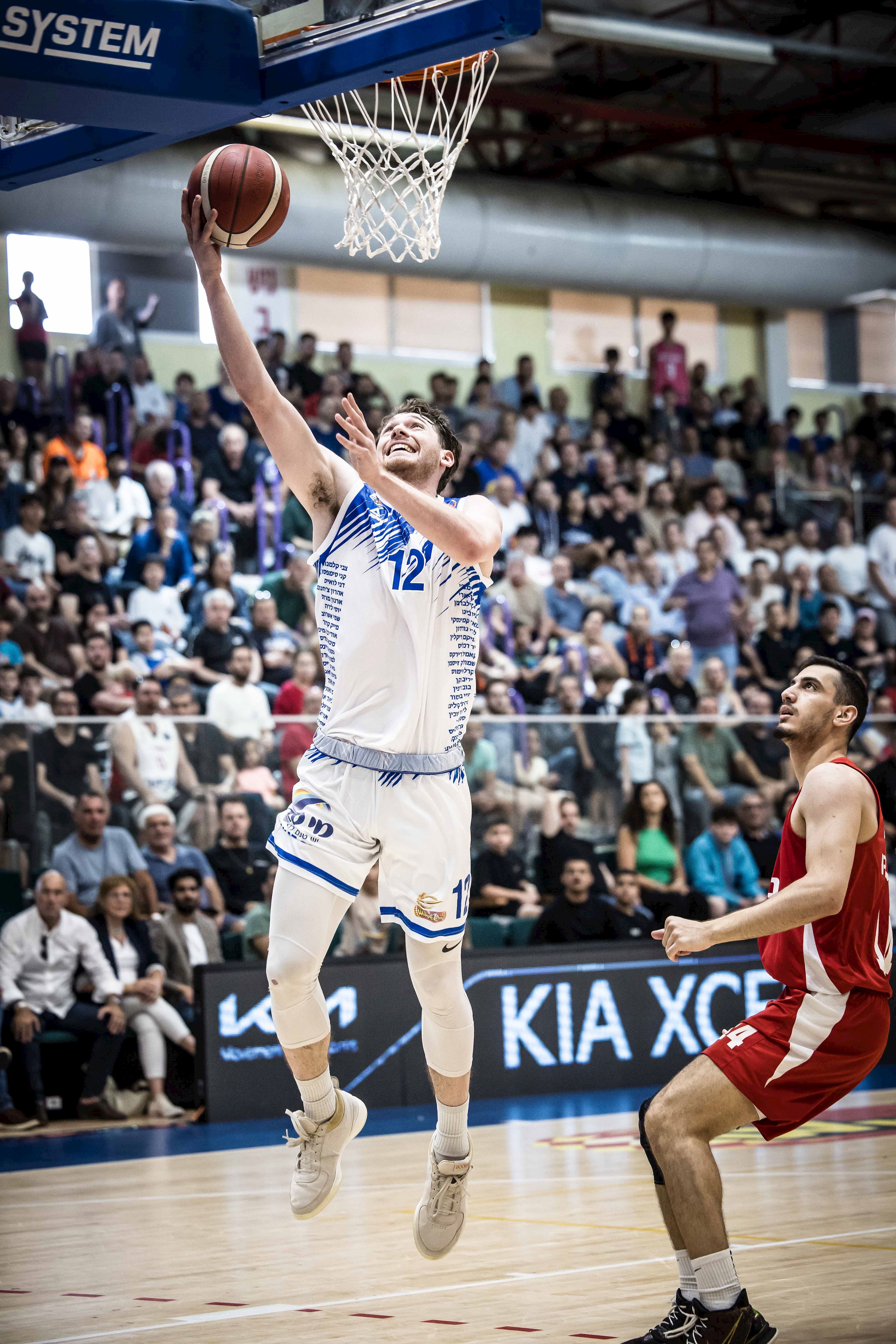 לוי זורק מעל אומאט. קלע את הנקודות הראשונות במשחק (צילום: עודד קרני)