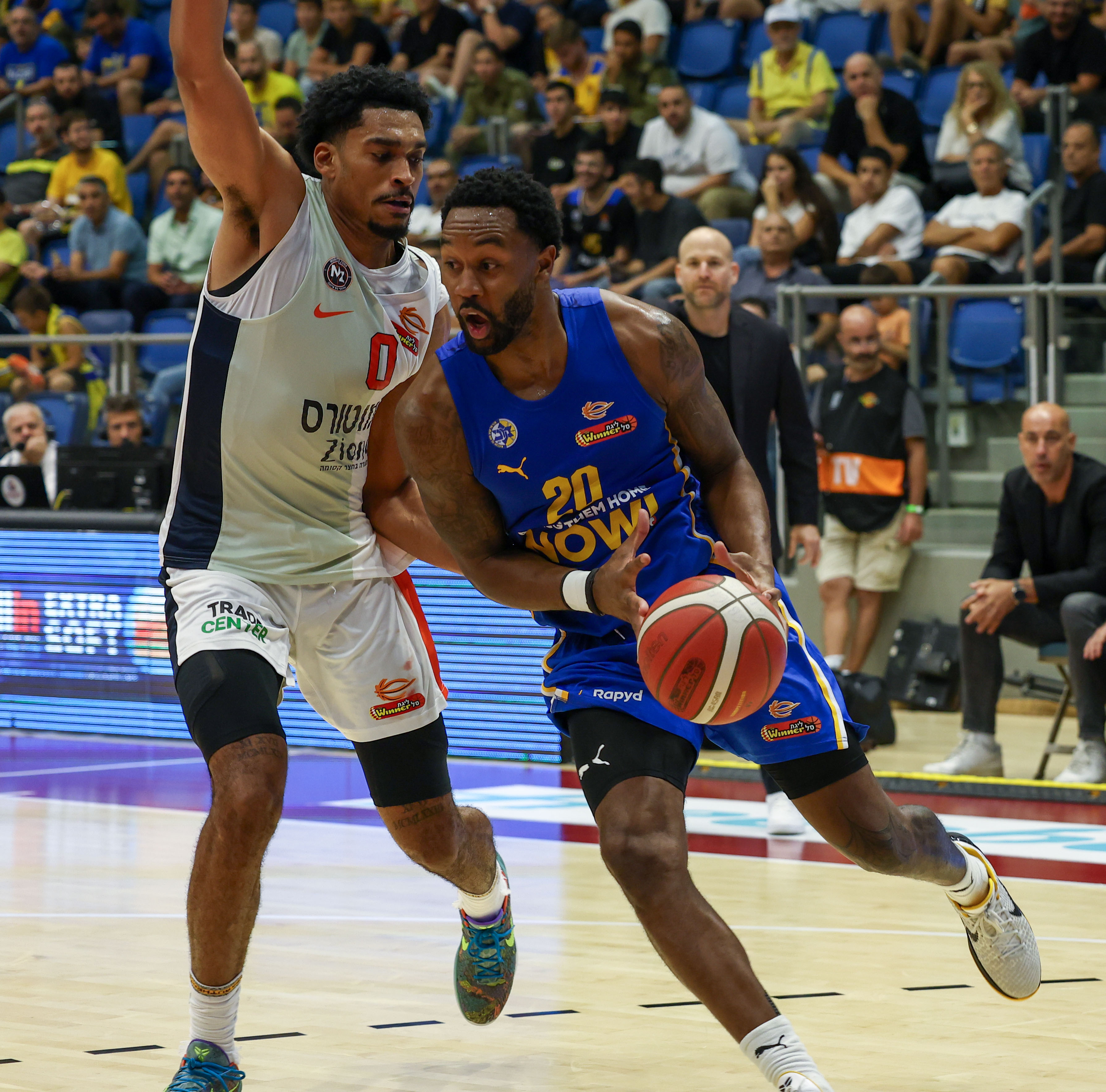 לינדו מנסה לעצור את ריימן. 15 נקודות שלו לא הספיקו לכתומים (צילום: דני מרון)