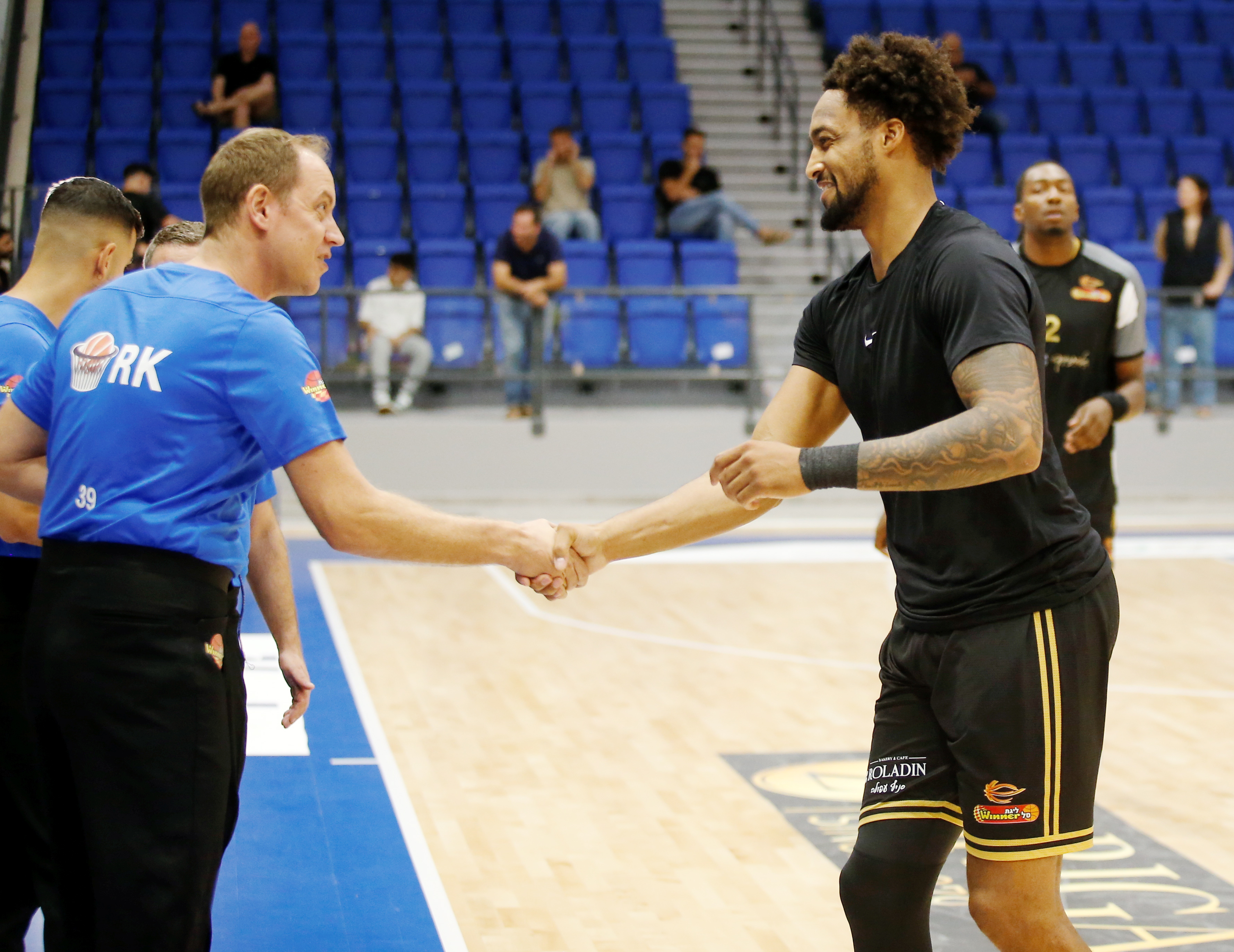 טוקוטו לוחץ יד לשופט לפני הפתיחה (צילום: אלן שיבר)