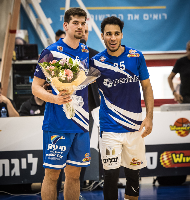 סהר מקבל פרחים מקבוצתו הקודמת בליגת ווינר סל (צילום: עודד קרני)