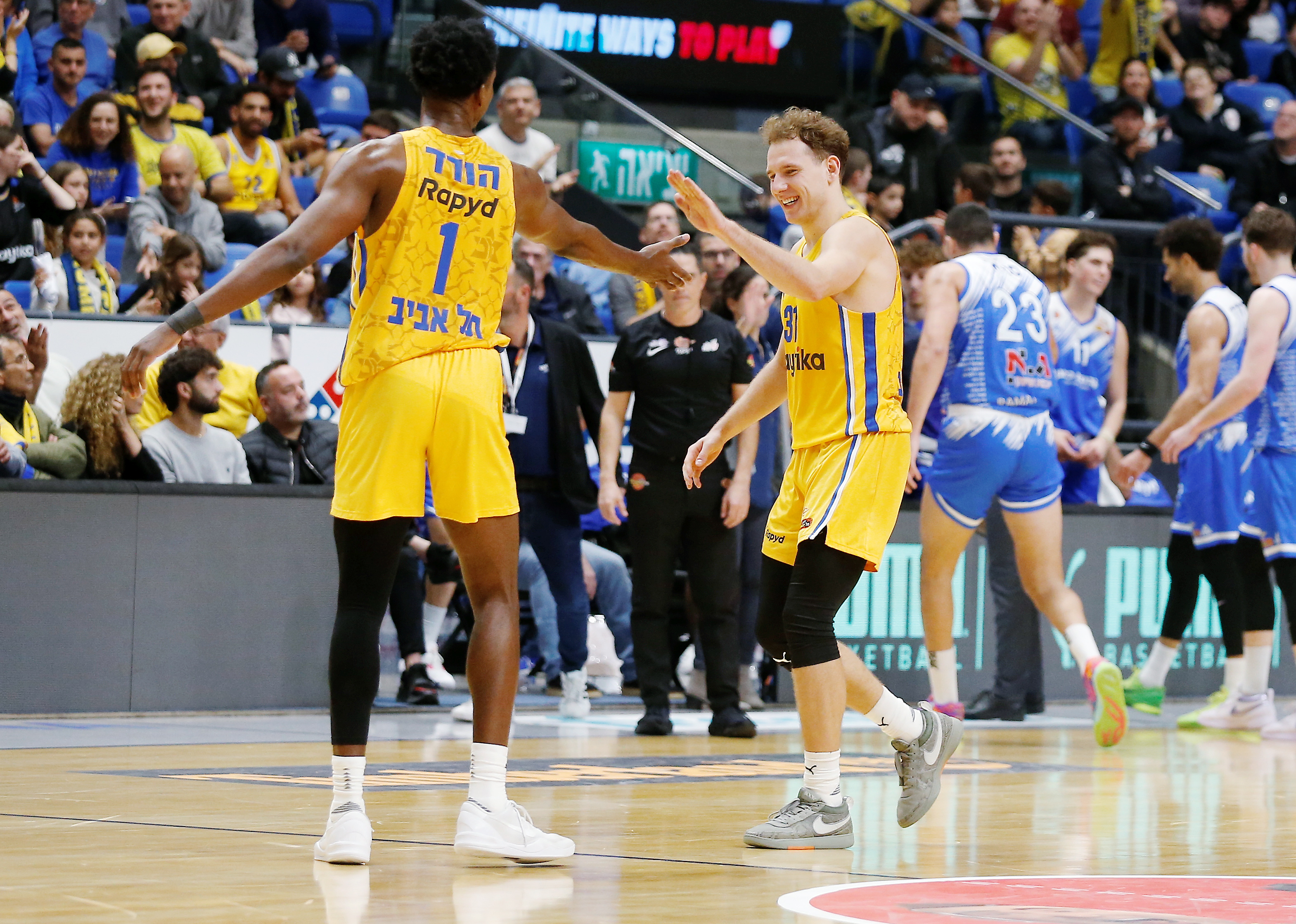 בהתאם לעובדה שמדובר במשחקה השני של האלופה בתוך 48 שעות והראשון מתוך שלושה השבוע, קטש חילק את הזמנים במשורה כאשר אף שחקן לא קיבל יותר מ־23 דקות – אך כל אחד מ־11 הצהובים שעלו הערב על הפרקט קלעו נקודות, וחמישה מהם גם הגיעו לספרות כפולות. מריאל שאיוק, שנרשם למשחק הבכורה שלו בישראל על חשבונו של ליוואי רנדולף, הוביל את הקלעים עם 17 נקודות כולל 4/6 לשלוש לצד ארבע חטיפות – בעוד רוקאס יוקובאיטיס המשיך בכושרו הנפלא מהניצחון בברלין, כשהוא רושם הפעם 13 נקודות ושישה אסיסטים. ג'ייק כהן, שעד כה לא זוכה העונה לדקות רבות ביורוליג, ניצל את ההזדמנות שקיבל הערב כדי לקלוע כמות נקודות זהה לשל הליטאי עם החטאה אחת בלבד מהשדה – ואילו חסיאל ריברו סיים את משחקו הראשון בליגה מאז חזרתו מהפציעה עם 11 נקודות ושישה ריבאונדים. עומר מאייר קלע אף הוא בדו־ספרתי לרבות שתי שלשות ב־40%, כשהקבוצה כולה מדייקת ב־11 מ־30 זריקותיה מחוץ לקשת. דייויד דג'וליוס אומנם סיים עם 0/4 מהטווח, אך היה רחוק שתי נקודות מספרות כפולות ומסר גם חמישה מתוך 24 האסיסטים שחילקו הצהובים לעומת עשרה איבודים קבוצתיים בלבד. התל־אביבים קטפו 12 כדורים חוזרים בהתקפה – בדיוק פי שניים מהיריבה – וחטפו גם עשרה כדורים.