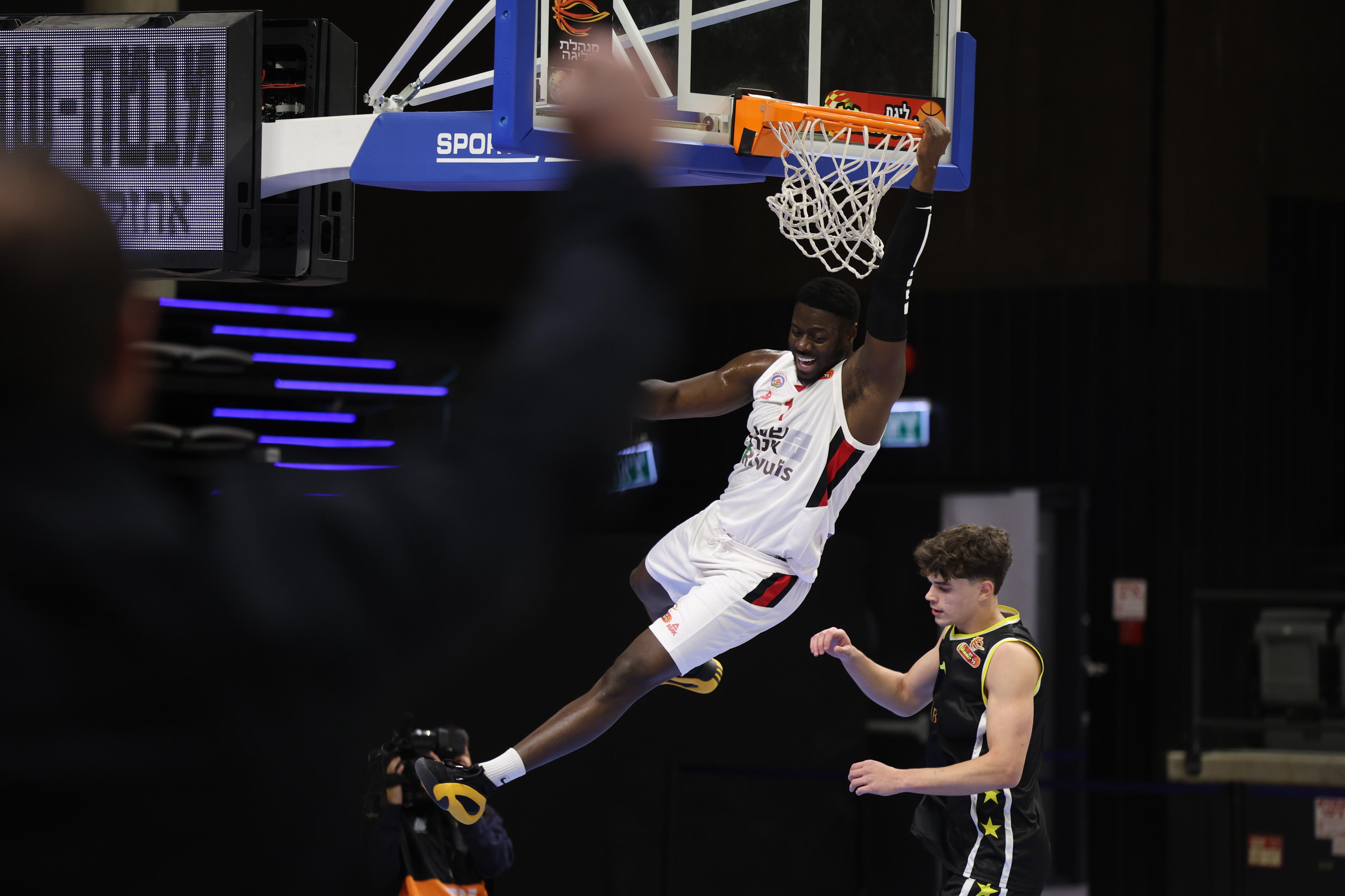 אולקינס מטביע. הריץ את המארחת ליתרון דו־ספרתי בסיום הרבע הראשון (צילום: גיל נוימן)