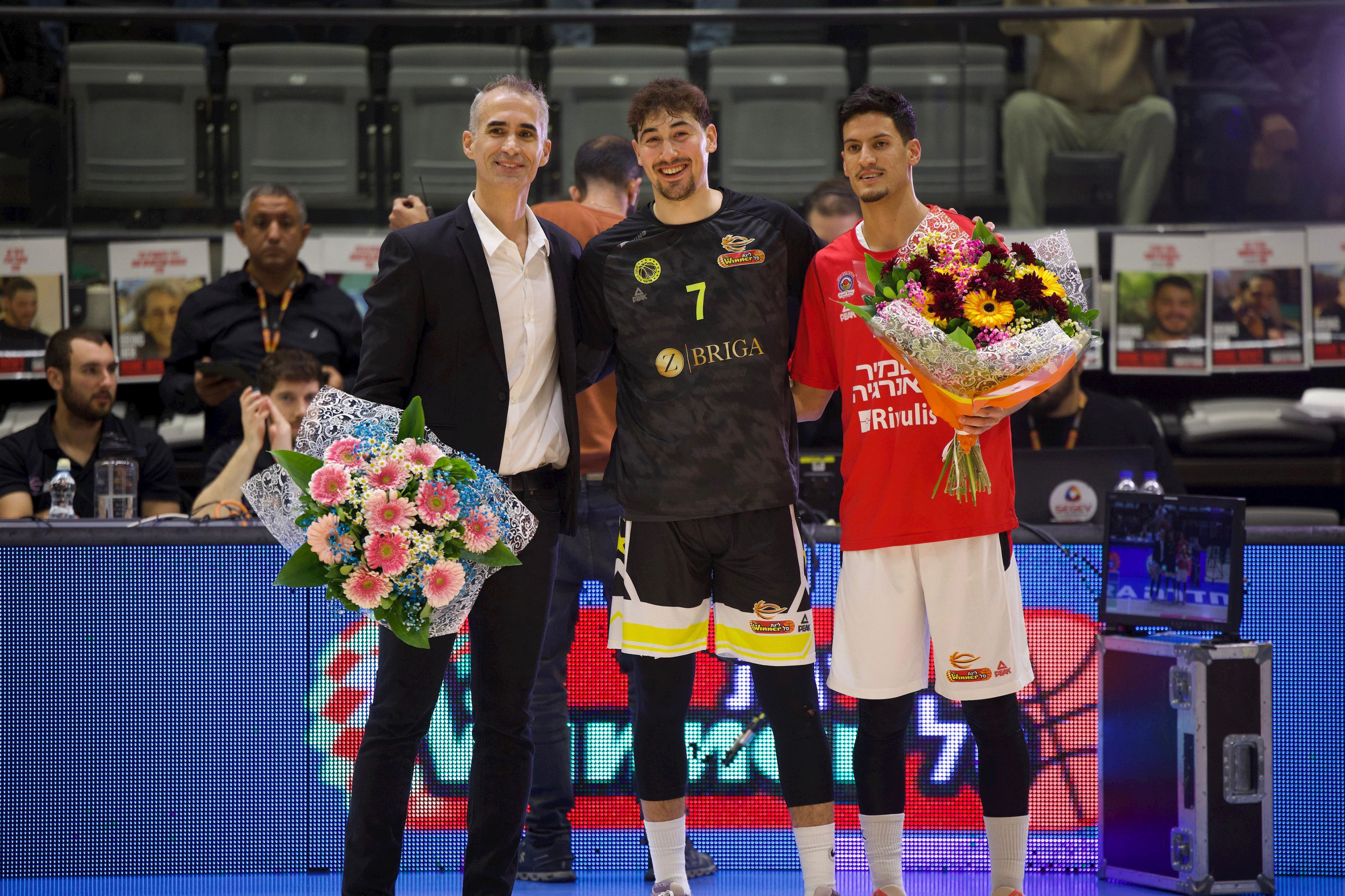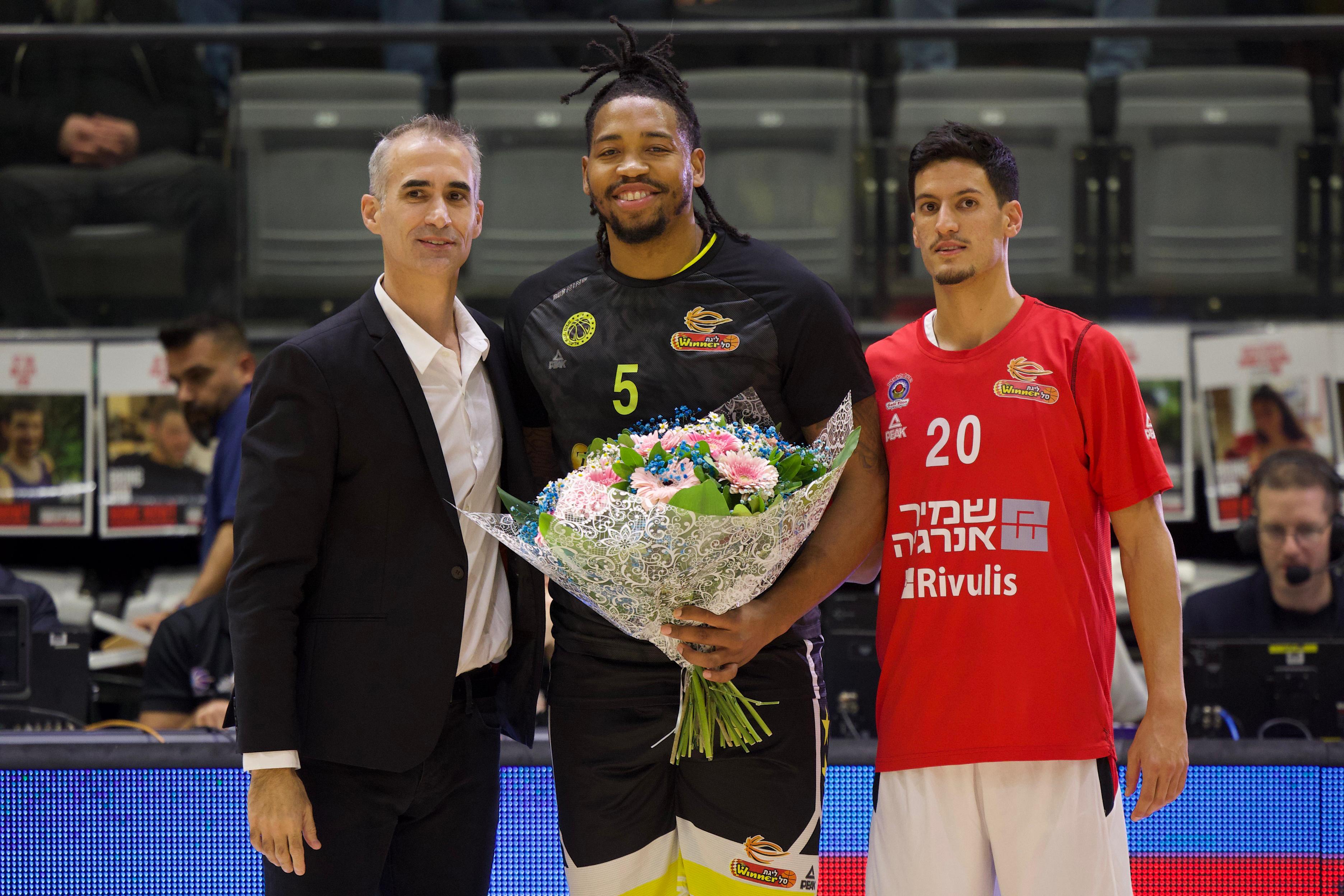 וושינגטון ומושקוביץ קיבלו פרחים מקבוצתם הראשונה בליגת ווינר סל (צילומים: גיל נוימן)