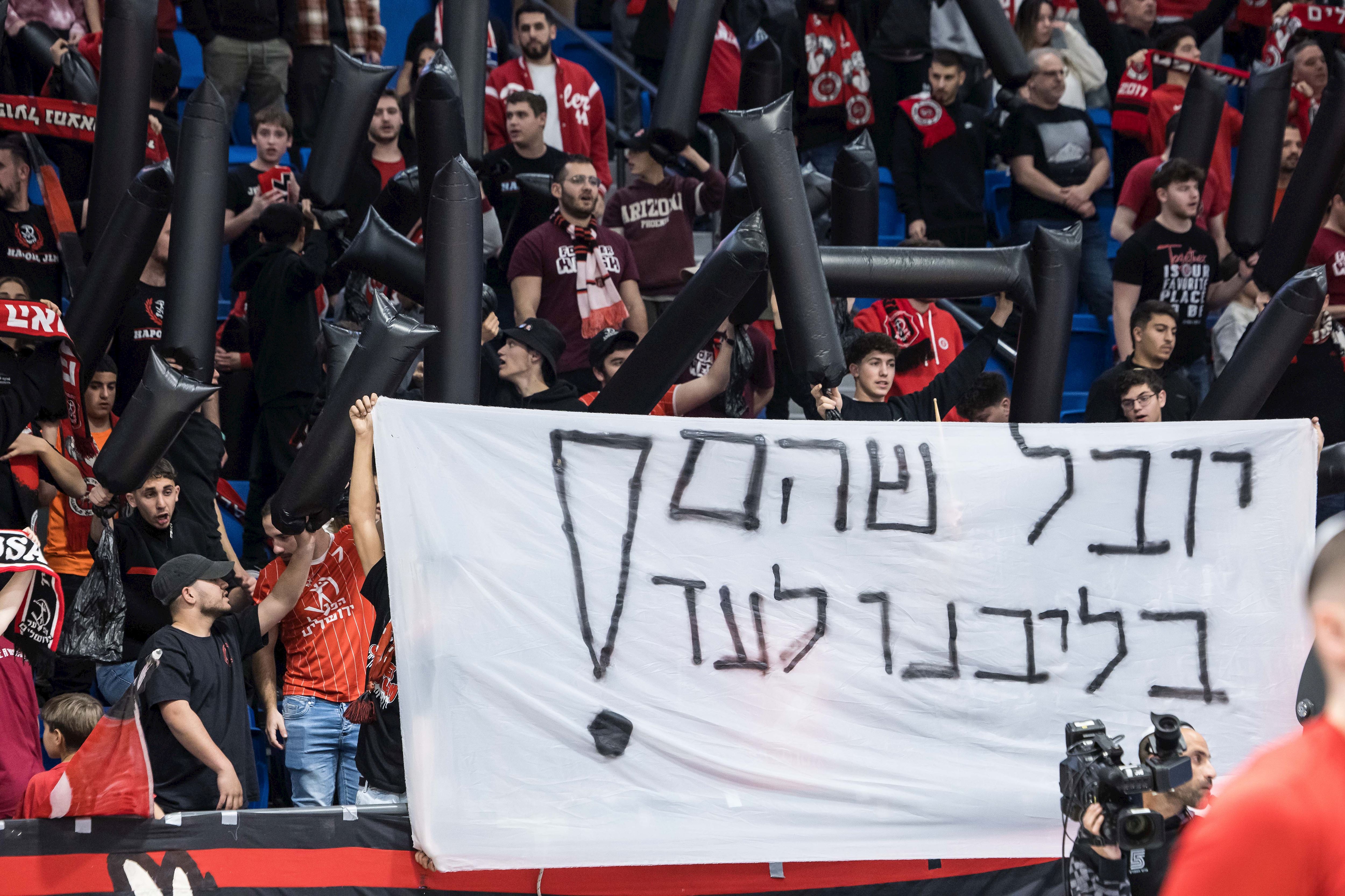 אוהדי ירושלים הניפו שלט לזכרו של סמ"ר יובל שהם ז"ל, שנפל היום בעזה (צילום: עודד קרני)