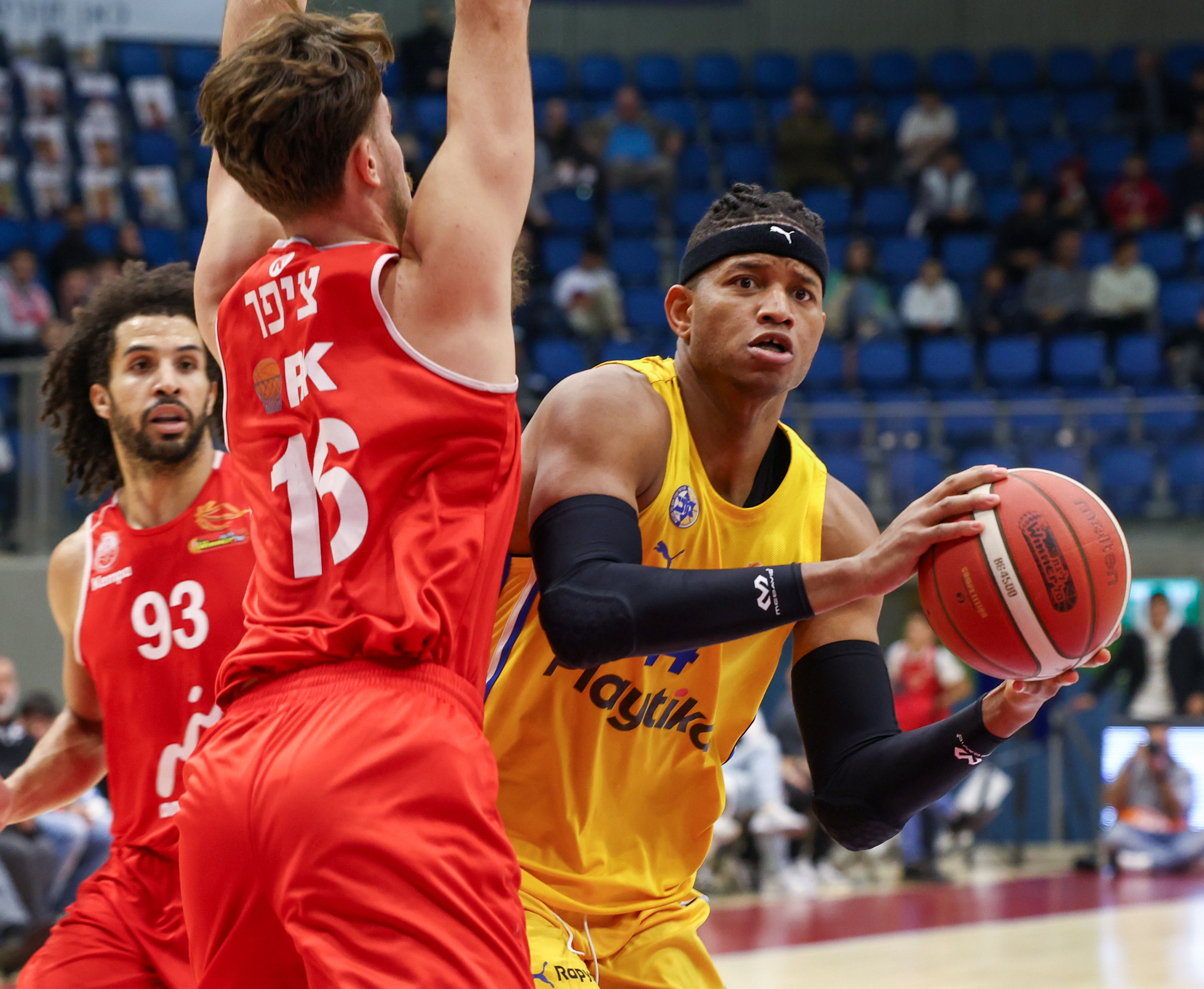 מולינאר מחפש מסירה מול הגנת הצהובים. קבוצתו נשארה קרובה בהפסקה (צילום: דני מרון)