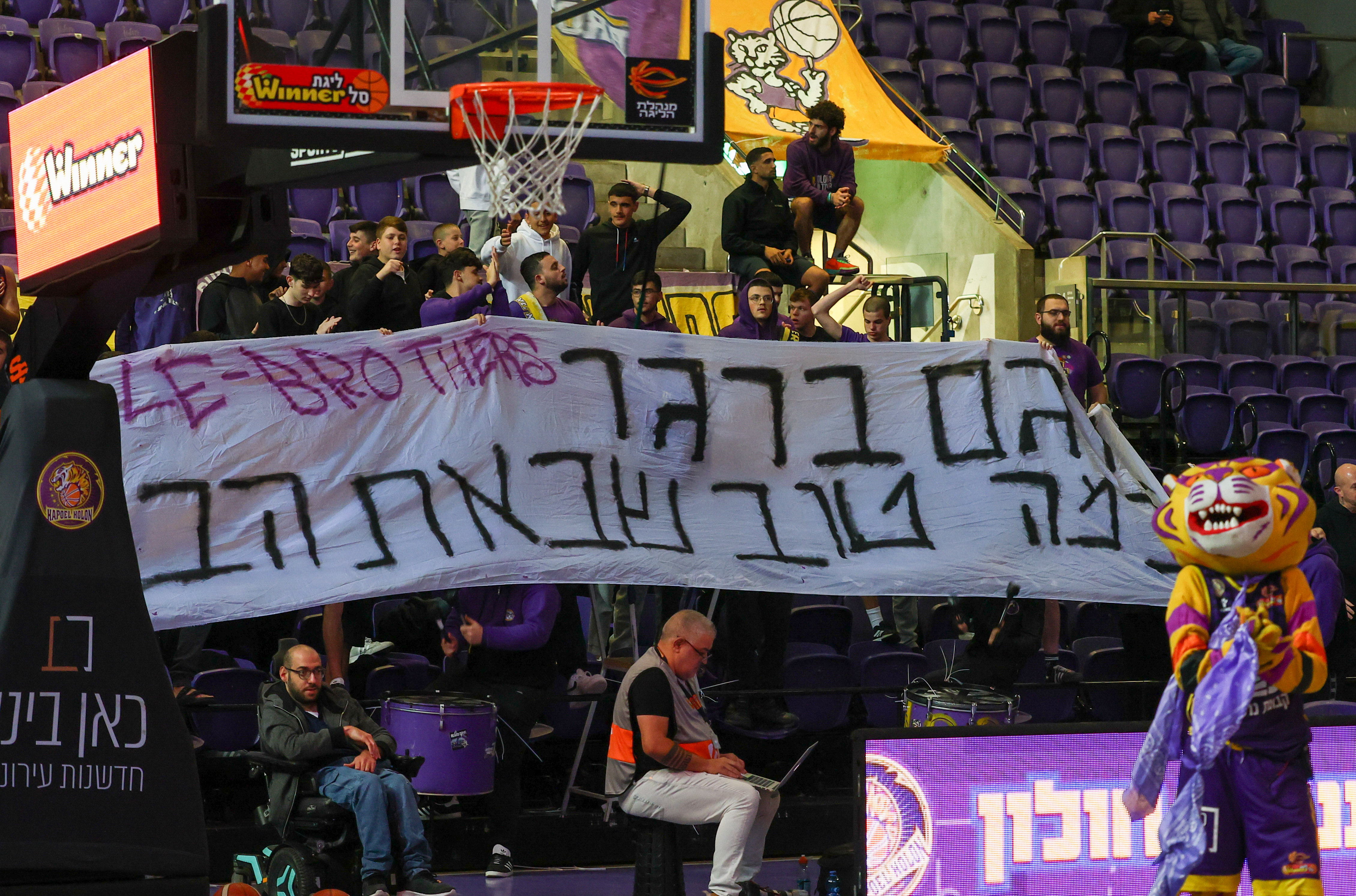 האוהדים הניפו שלט לכבוד חזרתה של אגם ברגר מהשבי (צילום: דני מרון)