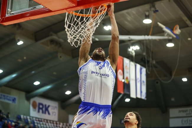סטיבנס מטביע. רמת גן לא מצאה פתרונות בהגנה (צילום: לירון מולדובן)