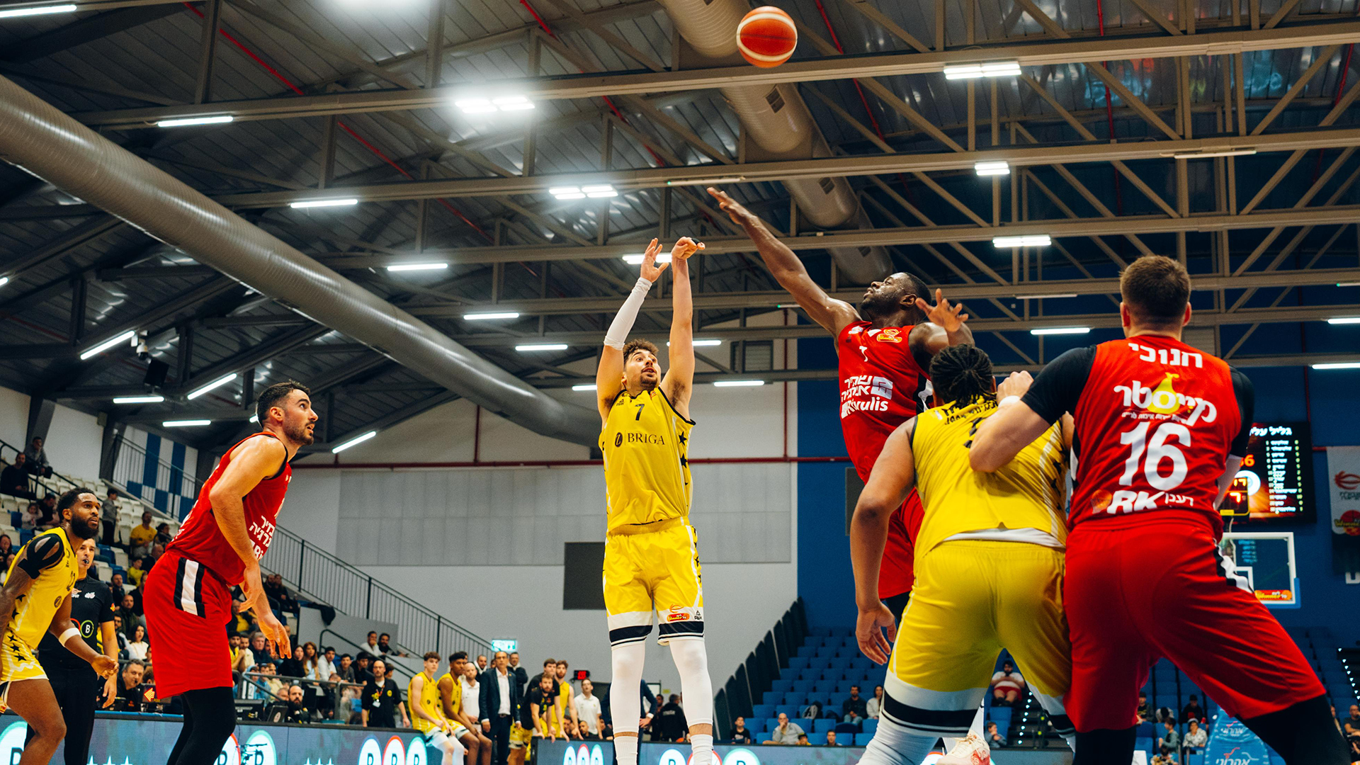 מושקוביץ זורק לשלוש. יתרון נוח למארחת בהפסקה (צילום: להב ראובני, אליצור נתניה)
