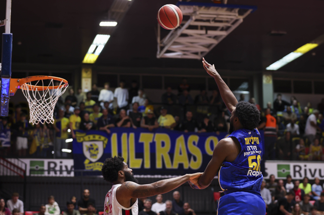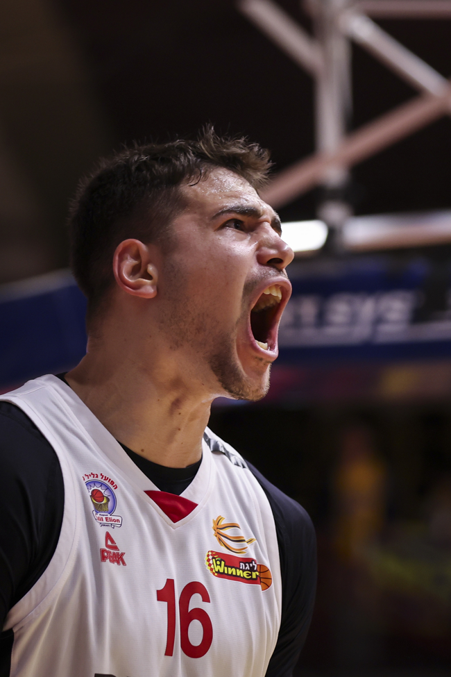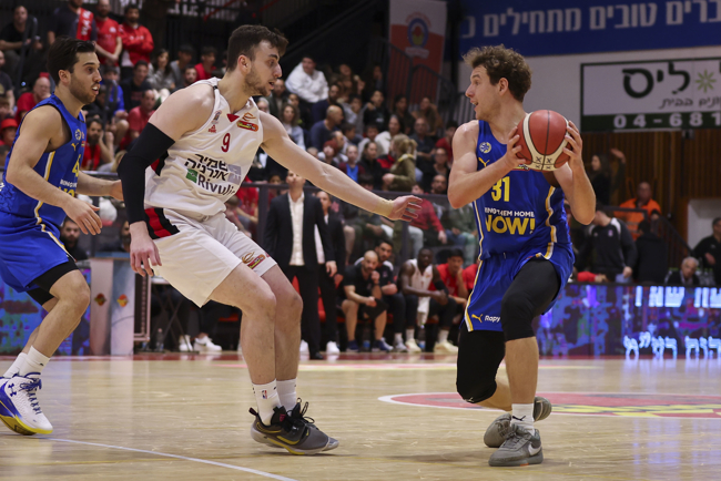 מכבי "Playtika" תל אביב נכנסה לרבע האחרון מול הפועל "Rivulis" גליל עליון בפיגור נקודה, אך ביצעה מהפך בדרך ל-67:79. סורקין בלט (צילום: מאור אלקסלסי)