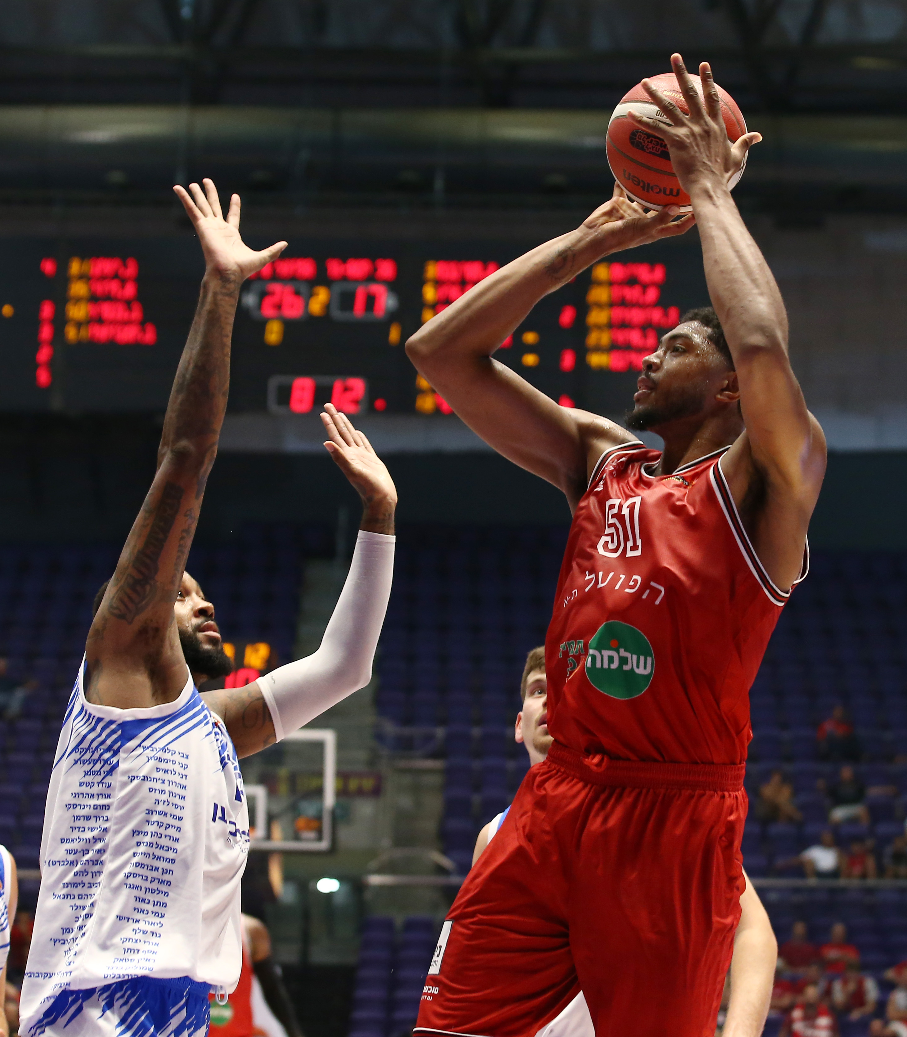 קאבוקלו זורק מעל מיילס. דומיננטי בשורות האדומים (צילום: אודי ציטיאט)