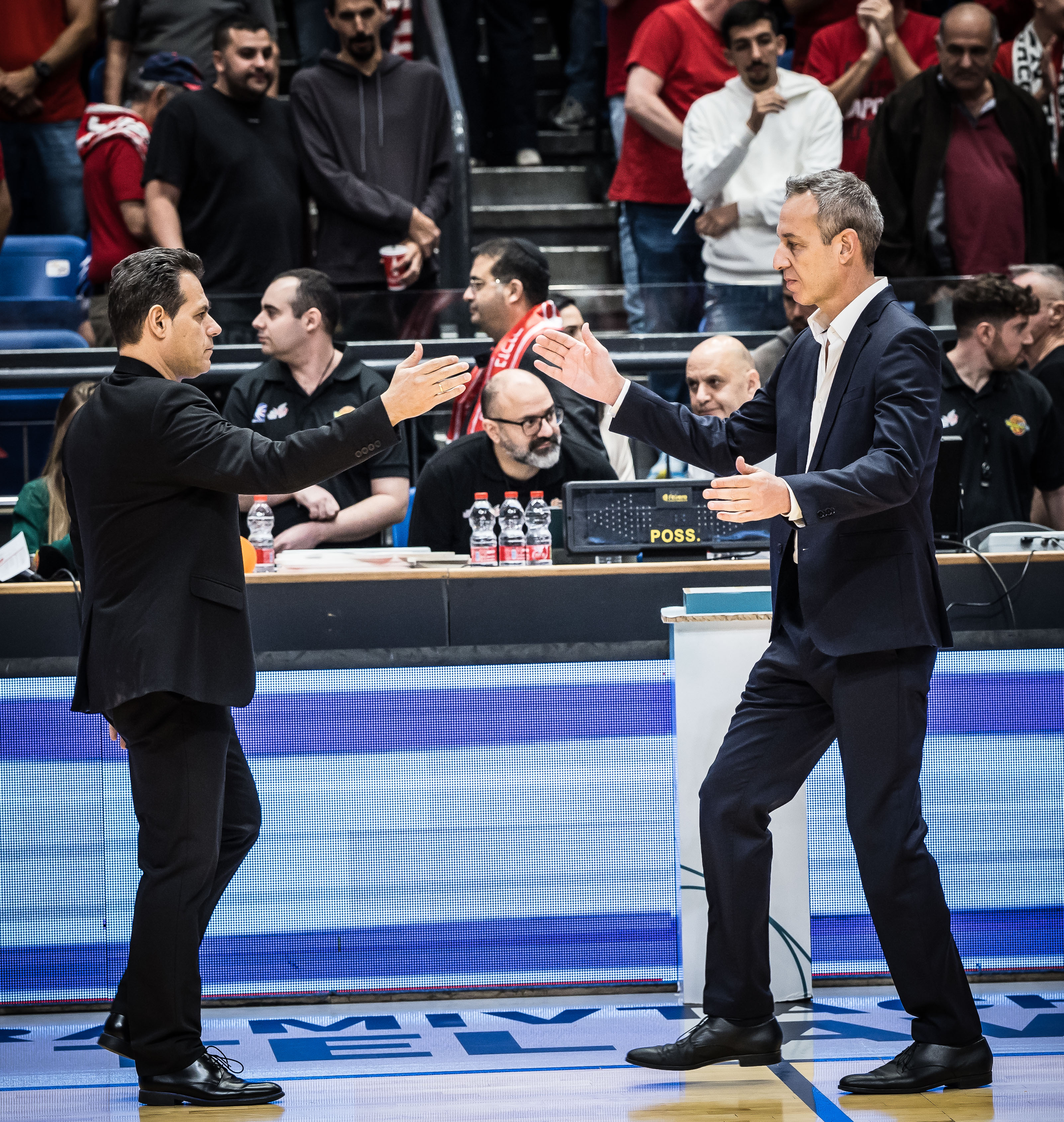 הערב החל בלחיצת יד מסורתית בין המאמנים... (צילום: עודד קרני)