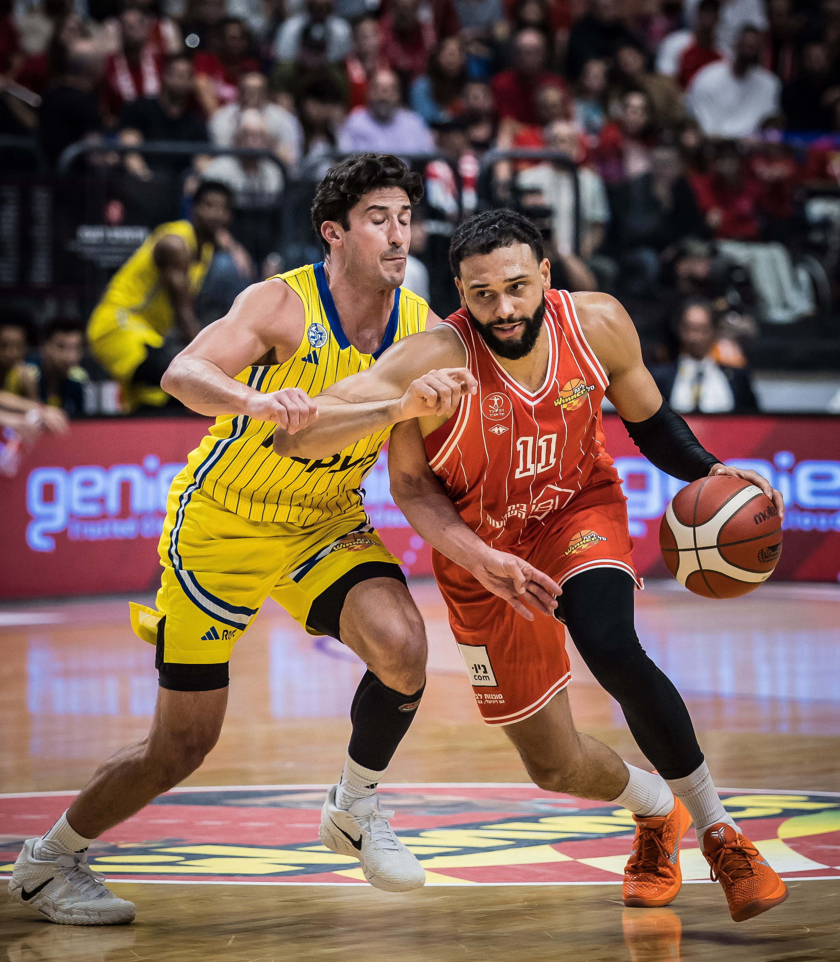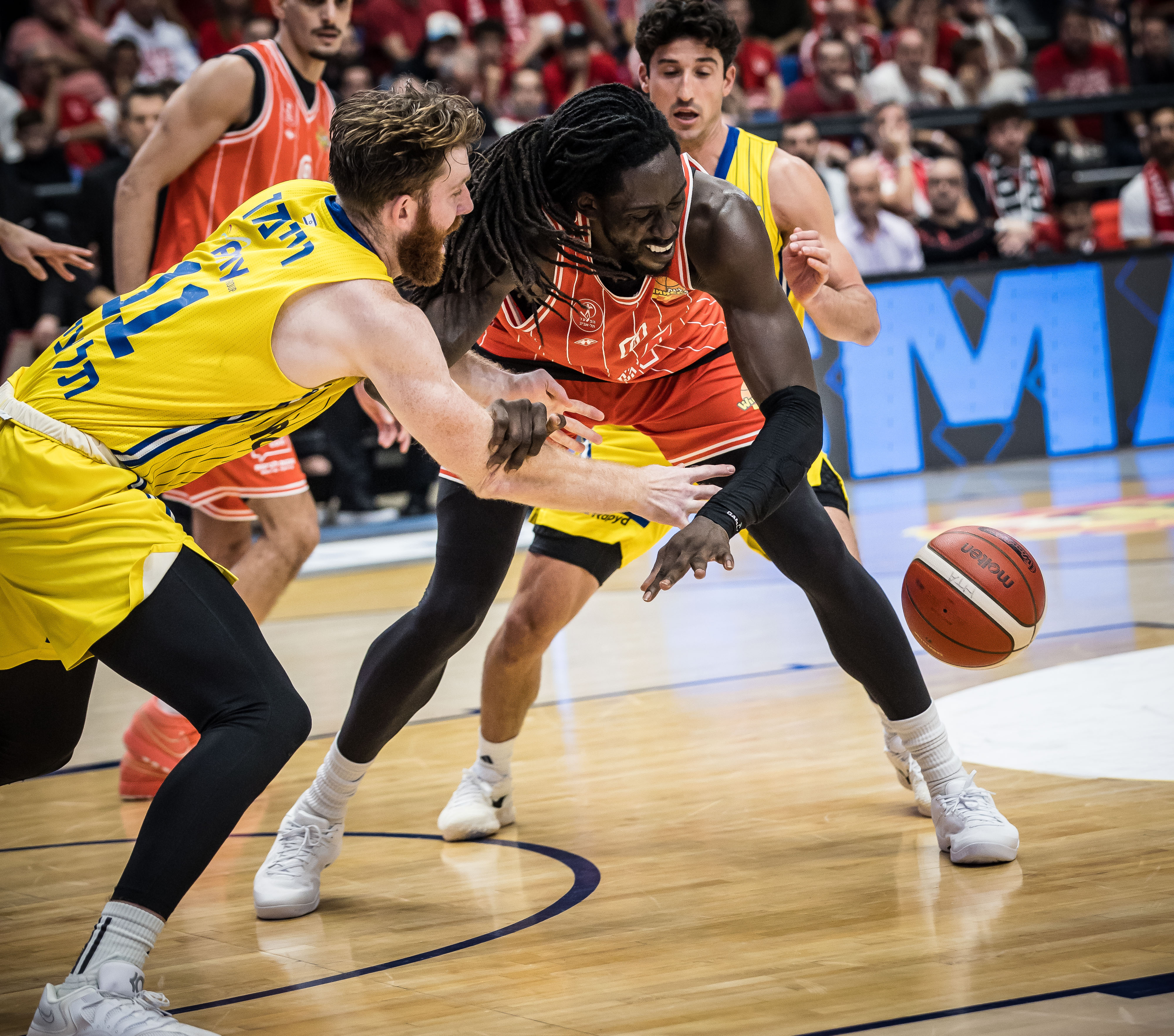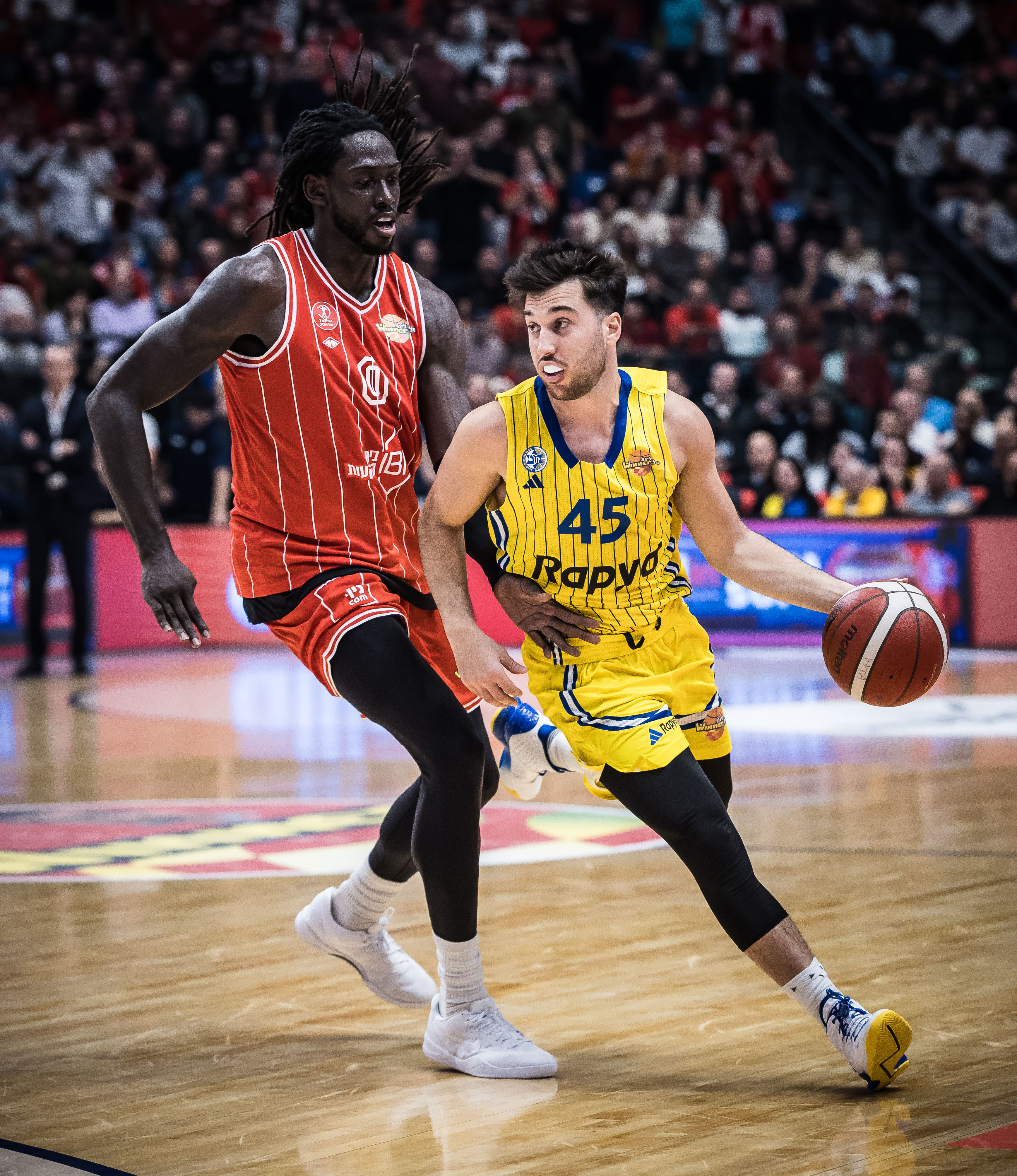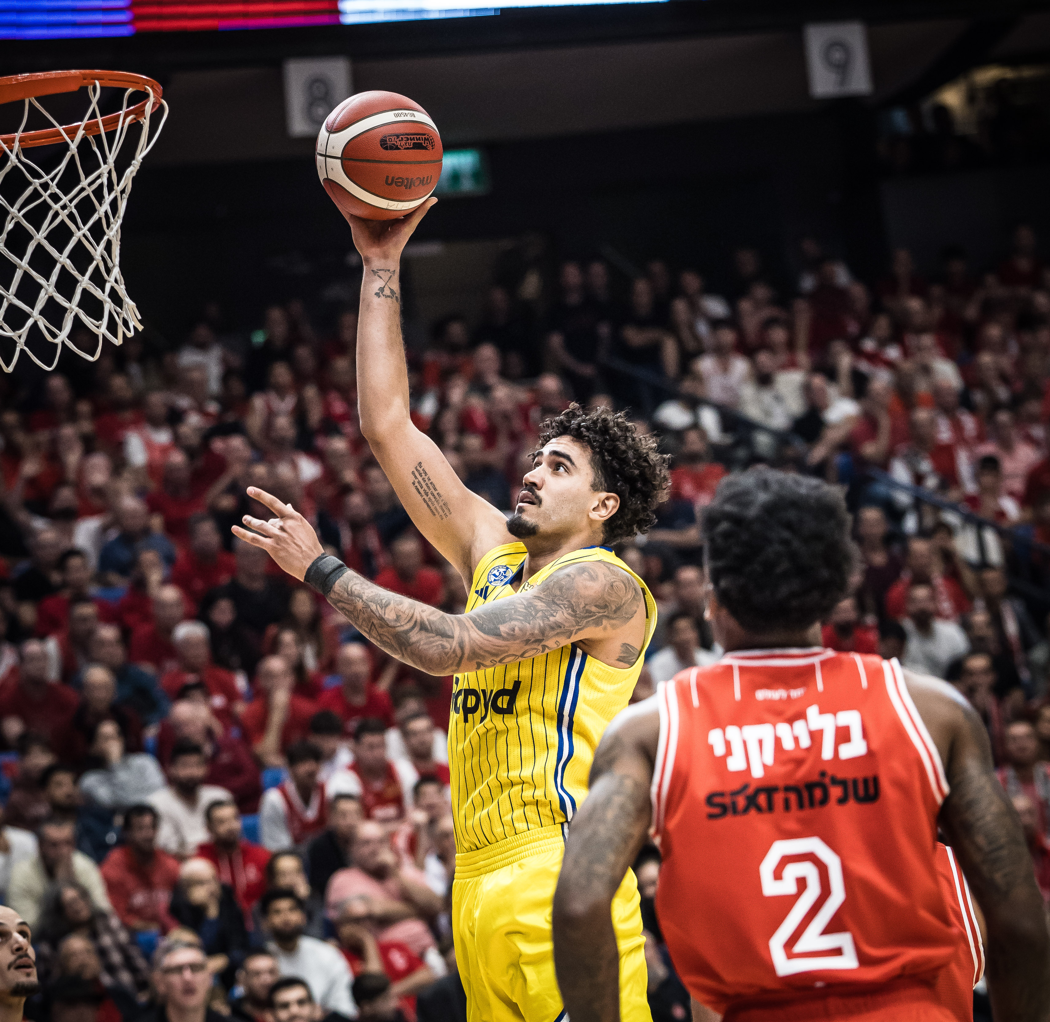 המארחת באדום פתחה עם אניס, טימור, בלייקני, מוטלי ואוטורו, ואילו האורחת בצהוב עלתה עם בלאט, דאוטין ג'וניור, בריסט, הורד וסורקין. המחצית הראשונה בהיכל מנורה מבטחים התחלקה לשניים. במשך רבע וחצי זה היה משחק צמוד, הפכפך ומלא באמוציות - כיאה לדרבי הגדול של תל אביב - אבל גם היה קשה להצביע על מגמה כזו או אחרת, שכן אף אחת מהקבוצות לא הצליחה לפתח מומנטום משמעותי. אלא שבדקות האחרונות של המחצית הסיפור השתנה: מוטלי העלה את האדומים ליתרון 38:40 עם שלשה מדויקת ארבע דקות וחצי לסיום הרבע השני, אבל זה גם היה סל השדה האחרון של הפועל תל אביב עד ההפסקה. מכבי תל אביב שמרה מצוין בצד אחד של המגרש, ובצד השני שלשה של בלאט כמעט מחצי מגרש חתמה ריצת 1:11 צהובה.