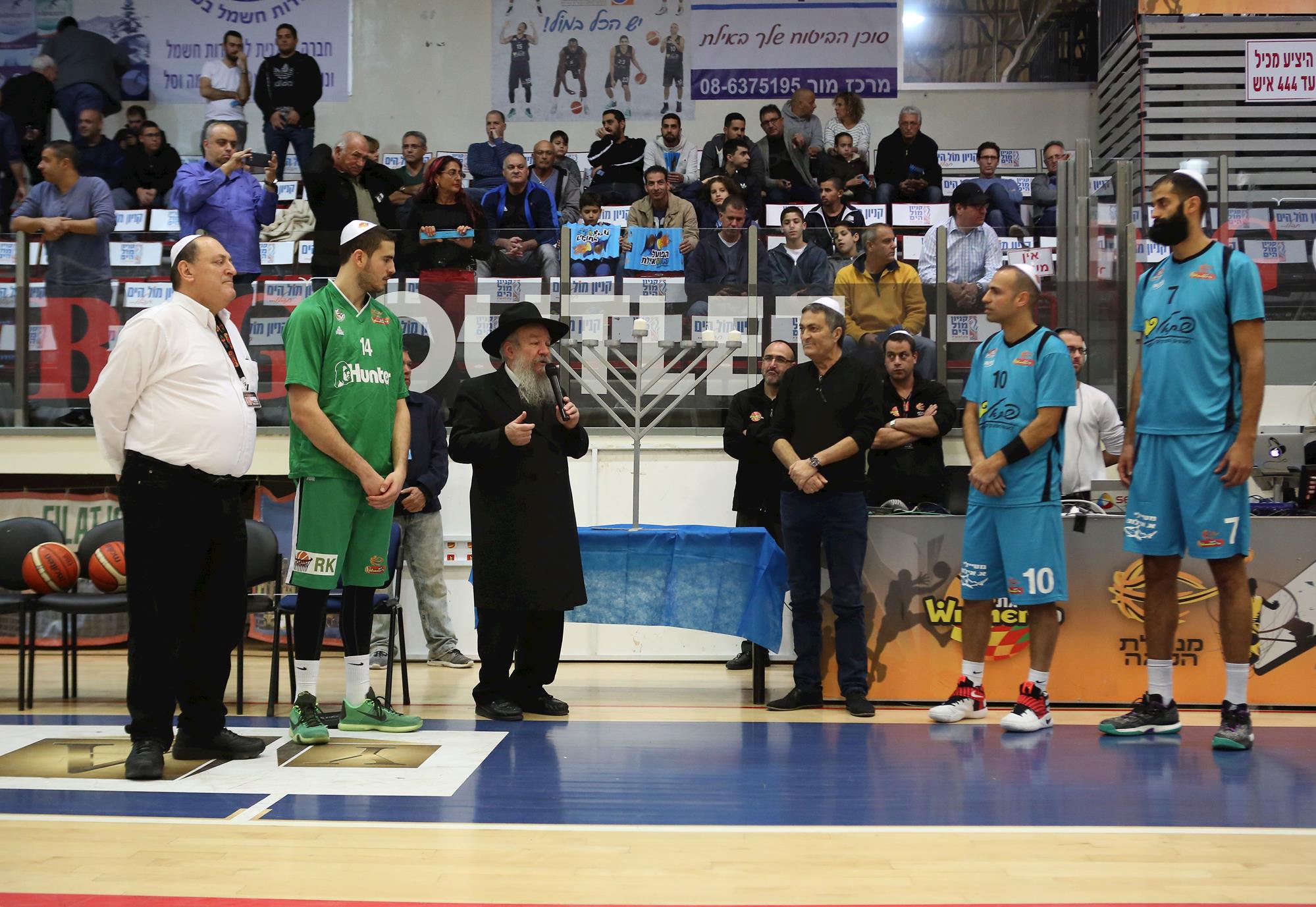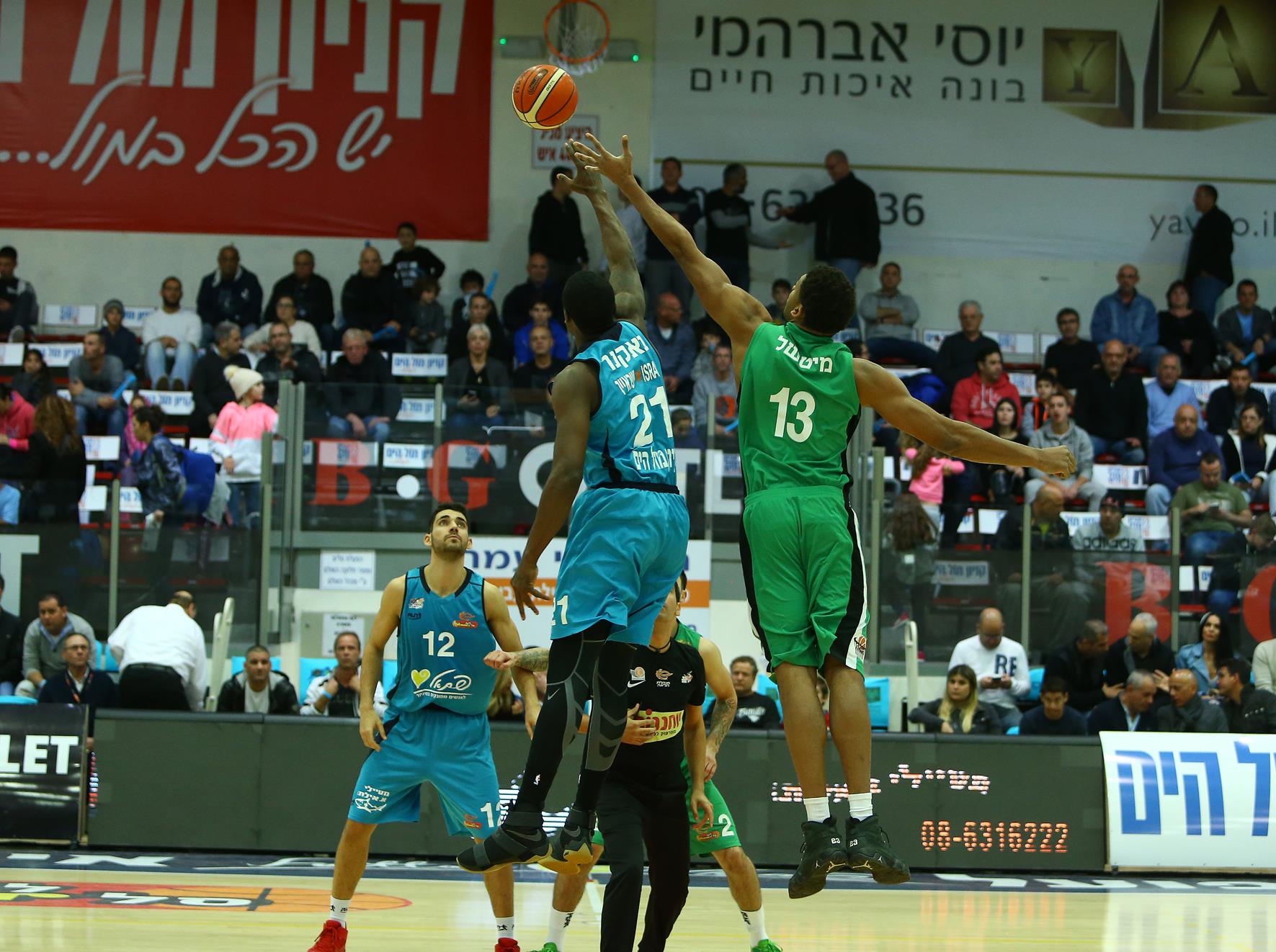 באקנר ומיצ'ל קופצים לכדור הראשון במשחק (צילום: אודי ציטיאט)