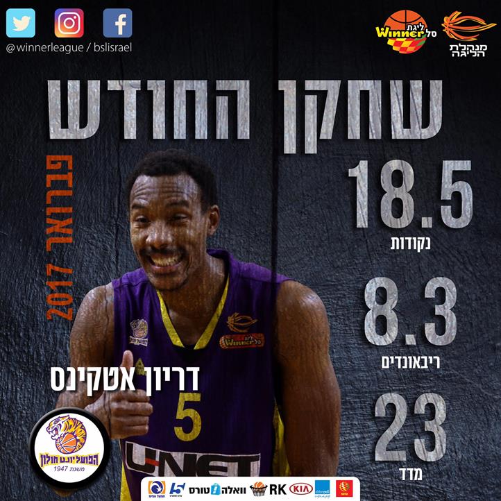 בפעם השנייה העונה, דריון אטקינס הוא שחקן החודש בליגת ווינר סל. פאנל הבוחרים, המורכב מעיתונאי כדורסל מכל גופי התקשורת, העניק לגבוה הנפלא של הפועל "יונט" חולון את הבחירה עם רוב של 60% מהקולות. אטקינס כבר נבחר לתואר בחודש אוקטובר וחברו הפצוע לקבוצה, קאליף ווייאט, זכה בכבוד בחודש דצמבר.