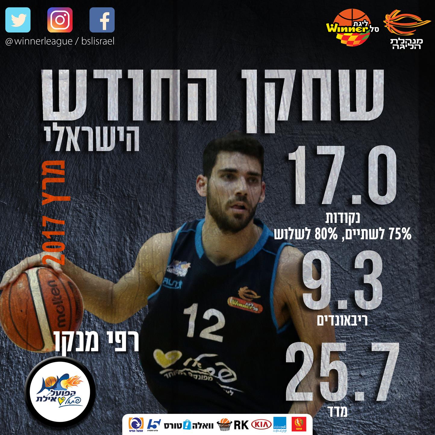 בפתיחת העונה, הפועל "פתאל" אילת עוד נאבקה בתחתית הטבלה ורפי מנקו מיעט לשחק, אבל מאז שהוא עבר מהבירה דרומה, החבורה של עודד קטש חזרה למקומה הטבעי בצמרת והפורוורד הפך לאחד השחקנים הכי משמעותיים בליגה. פאנל הבוחרים, המורכב מעיתונאי כדורסל מכל גופי התקשורת, בחר אותו כמעט פה אחד לשחקן הישראלי המצטיין של חודש מרץ בליגת ווינר סל והוא יזכה במילגת לימודים בסך 2,000 דולרים מתנת רענן כץ. למקום השני הגיע ג'ייק כהן ממכבי "קפלן" אשדוד/באר טוביה.