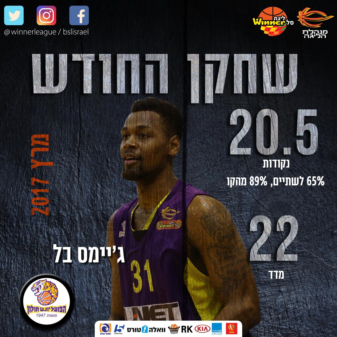 "ההשתלטות" של שחקני הפועל "יונט" חולון על התארים האישיים נמשכת. אחרי דריון אטקינס שנבחר לשחקן החודש של ליגת ווינר סל באוקטובר ובפברואר וקאליף ווייאט שנבחר למצטיין בדצמבר, הגיע תורו של ג'יימס בל. פאנל הבוחרים, המורכב מעיתונאי כדורסל מכל גופי התקשורת, העניק לפורוורד של הסגולים את תואר ה-MVP של חודש מרץ עם רוב של 61% מהקולות. הוא הקדים את רפי מנקו מהפועל "פתאל" אילת שהגיע למקום השני ואת מרפי הולוואי מהפועל גלבוע/גליל שסיים שלישי במשאל.
