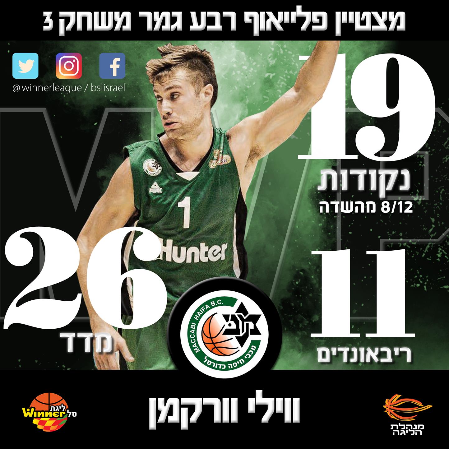 ווילי וורקמן עבר עונה לא קלה, עם מספר פציעות ומחלה שגרמו לו להחמיץ כמעט שליש מהעונה הרגילה. אף על פי כן, הפורוורד של מכבי "Hunter" חיפה שנוצח עם קבוצותיו בארבעת משחקיו הראשונים בפלייאוף ונעצר בכולם על חד-ספרתי, התעלה בשני המשחקים האחרונים ונבחר לשחקן המצטיין של המחזור השלישי ברבע הגמר.