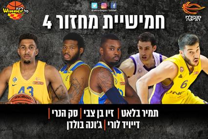 לצידם בחמישייה: תמיר בלאט שקלע שיא קריירה של 17 נקודות והוביל את הפועל "יונט" חולון לניצחון בית ראשון העונה מול הפועל גלבוע/גליל; זיו בן צבי שהוקפץ לחמישייה בשל פציעתו של יפתח זיו וכיכב בניצחון השלישי ברציפות של עירוני נהריה עם 13 נקודות, 7 ריבאונדים ו-5 אסיסטים נגד בני "רב בריח" הרצליה; וג'ונה בולדן שהיה אחראי לבריחה של מכבי "FOX" ת"א בסיום המשחק מול מכבי "Hunter" חיפה עם 20 נקודות (4-5 לשלוש) ומדד 28.