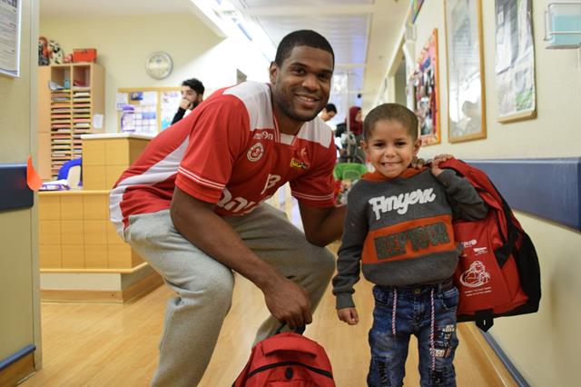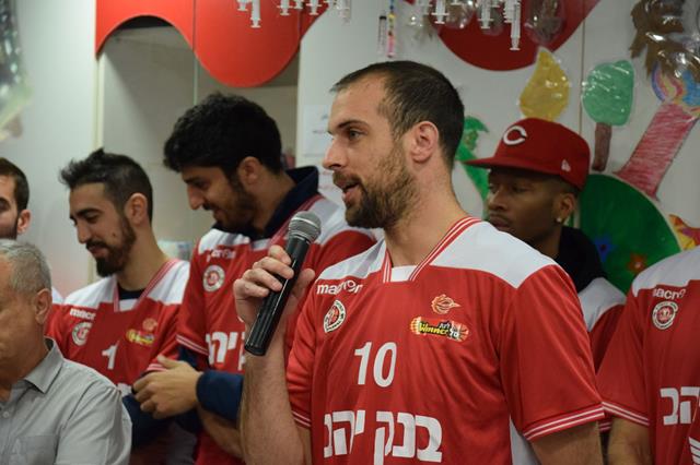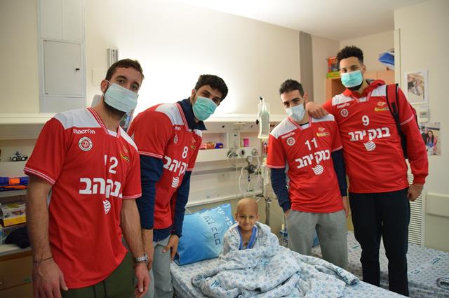 שחקני הפועל "בנק יהב" ירושלים העניקו תיקים מלאים הפתעות לילדים המאושפזים. יותם הלפרין: "מרגש להיות עם הילדים בכל שנה" (צילומים: אתר רשמי, הפועל י-ם)