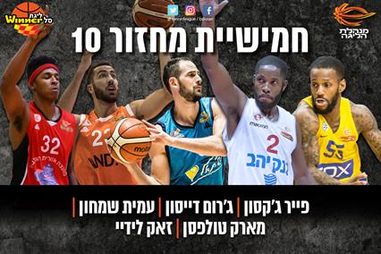 לצידו בחמישייה: פייר ג'קסון שהוביל את מכבי "FOX" ת"א לניצחון חוץ על עירוני נהריה עם 21 נקודות (4-5 לשלוש), 7 אסיסטים, 7 חטיפות ומדד 35; עמית שמחון שקלע 21 נקודות (5-7 לשלוש) בניצחון המרשים של הפועל "פתאל" אילת המתאוששת על מכבי אשדוד/באר טוביה; מארק טולפסן שרשם שורה סטטיסטית נדירה (23 נקודות, 12 ריבאונדים, 6 אסיסטים, 5 חטיפות ומדד 41) בניצחון החוץ הנוח של מכבי "ILAND.TV" ראשל"צ על בני "רב בריח" הרצליה; וזאק לידיי שהוסיף עוד דאבל-דאבל מרשים לאוסף עם 20 נקודות ו-12 ריבאונדים בניצחון השלישי ברציפות של הפועל גלבוע/גליל מול מכבי "Hunter" חיפה.