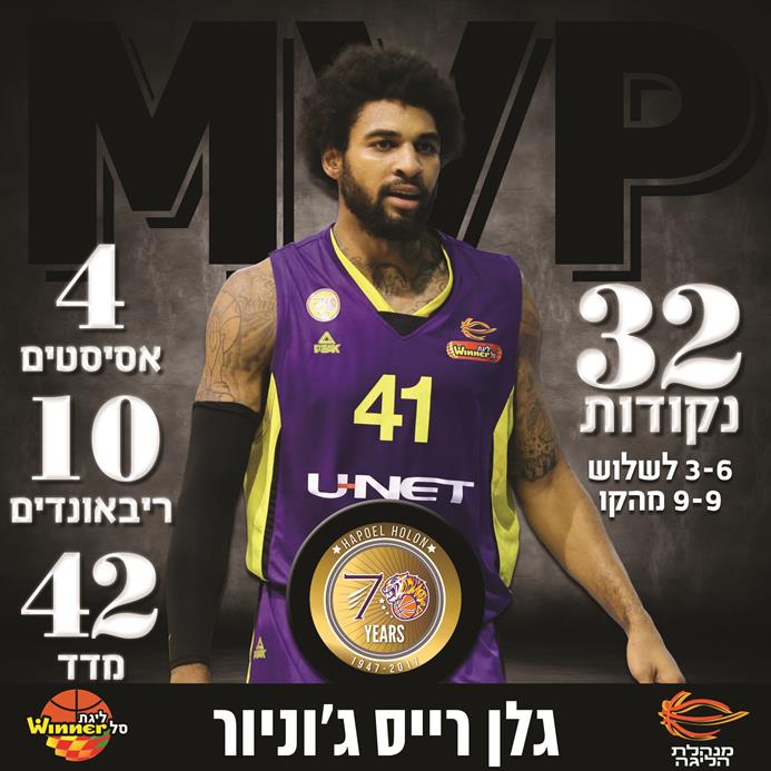 רייס ג'וניור, שנעדר משני משחקי הקבוצה הקודמים בשל פציעה, חזר בגדול עם 32 נקודות (7-15 לשתיים, 3-6 לשלוש, 9-9 מהקו), 10 ריבאונדים, 4 אסיסטים, 4 חטיפות ומדד 42. כמו כן, הוא הוביל את חולון במדד הפלוס-מינוס (12+) וקלע 11 מ-14 הנקודות האחרונות שלה במשחק, כולל דאנק שסגר את הסיפור באופן סופי.