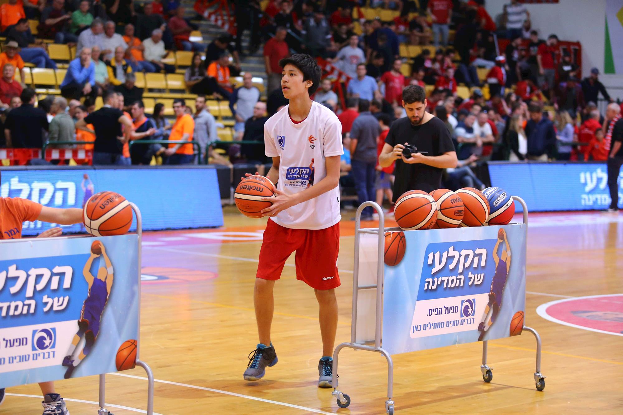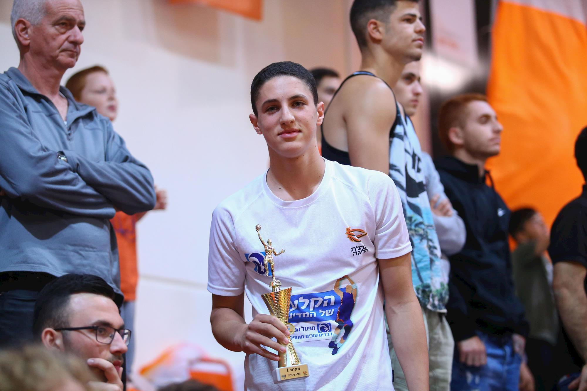 הקלעי בן ה-16 מירושלים, שהשתתף בתחרות השלשות באולסטאר, ניצח בתחרות של מנהלת הליגה בשיתוף מפעל הפיס בנס ציונה (צילום: לירון מולדובן)