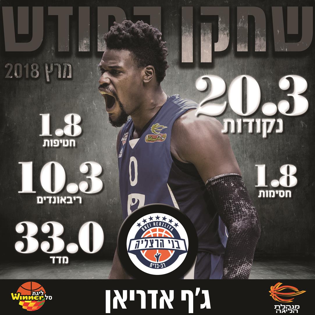 אחרי פתיחה עונה מאכזבת שדירדרה אותה עד למקום האחרון בטבלה, בני "רב בריח" הרצליה מתחילה להתחבר ואחת הסיבות לכך היא היכולת של ג'ף אדריאן, שנבחר לשחקן המצטיין של חודש מרץ בליגת ווינר סל.