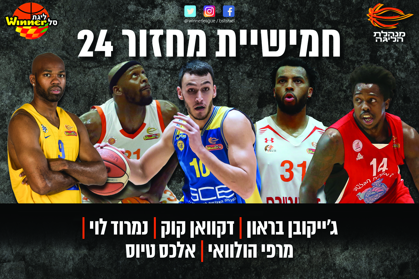 לצידו בחמישייה: ג'ייקובן בראון שהוביל קאמבק מדהים של הפועל גלבוע/גליל מול עירוני נהריה עם 24 נקודות; דקוואן קוק שלהט עם 26 נקודות (5-7 לשלוש) ב-23 דקות בניצחון המרשים של עירוני "חי מוטורס" נס ציונה על הפועל "SP מצר" ת"א; נמרוד לוי שרשם 18 נקודות, 9 ריבאונדים ומדד 23 בניצחון חוץ קשה של מכבי אשדוד/באר טוביה על בני "רב בריח" הרצליה ללא קמרון לונג וג'ראלד לי; ואלכס טיוס שתרם 16 נקודות ו-10 ריבאונדים בניצחון החשוב של מכבי "FOX" ת"א על הפועל "יונט" חולון.