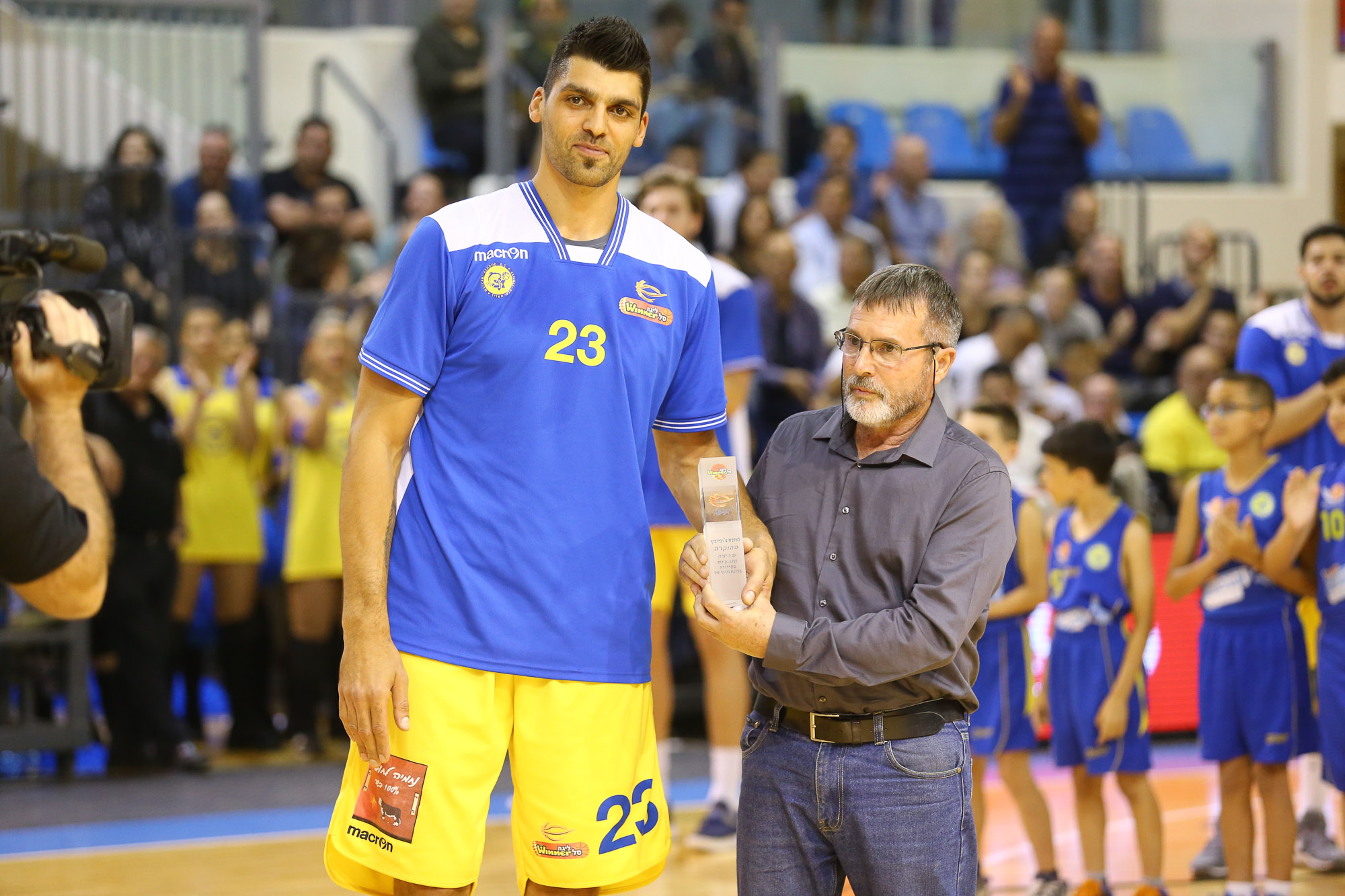 צ'וברביץ' מקבל מגן על הגעתו ל-1,000 נקודות מראש מועצת באר טוביה, דרור שור (צילום: לירון מולדובן)