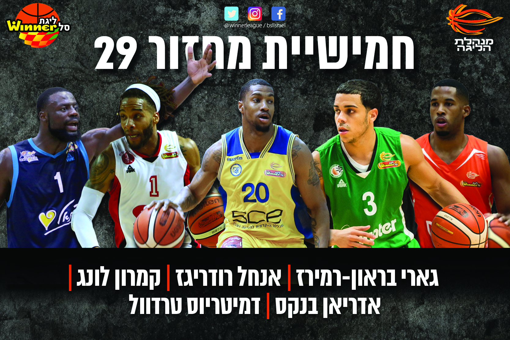 לצידו בחמישייה: גארי בראון-רמירז שהמשיך את השבוע המטורף שלו עם 29 נקודות ומדד 33 בניצחון עירוני "חי מוטורס" נס ציונה על בני "רב בריח" הרצליה; אנחל רודריגז שקלע 15 מ-31 נקודותיו ברבע האחרון, בו ברחה מכבי "Hunter" חיפה למכבי "ILAND.TV" ראשל"צ; אדריאן בנקס שלהט עם 22 נקודות ו-8 ריבאונדים בניצחון הפועל "SP מצר" ת"א על הפועל "בנק יהב" ירושלים; ודמיטריוס טרדוול שחגג בצבע עם 23 נקודות, 14 ריבאונדים ו-3 חסימות בקאמבק של הפועל "פתאל" אילת מול מכבי "FOX" ת"א.