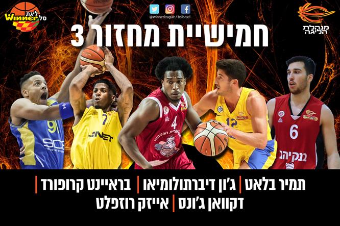 לצידו בחמישייה: תמיר בלאט שעזר להפועל "בנק יהב" ירושלים להישאר מושלמת עם 13 נקודות, 8 אסיסטים ומדד 17 נגד עירוני "חי מוטורס" נס ציונה; ג'ון דיברתולומיאו שכיפר על מכת הפציעות בקו האחורי של מכבי "FOX" ת"א עם 22 נקודות ומדד 29 בניצחון הדרמטי על הפועל באר שבע/בני שמעון; דקוואן ג'ונס שקלע 29 נקודות (11-15 מהשדה) בניצחון של הפועל "יונט" חולון על הפועל "מול הים" אילת בתום שתי הארכות; ואייזק רוזפלט שתרם 15 נקודות ו-7 ריבאונדים עבור מכבי אשדוד/באר טוביה מול בני "רב-בריח" הרצליה.
