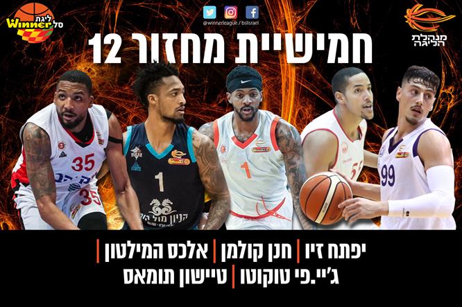 לצידו בחמישייה: קפטן הפועל באר שבע/בני שמעון החדש, חנן קולמן, שכיכב בניצחון החוץ על גלבוע/גליל עם שיאי עונה של 20 נקודות (6 מ-7 לשלוש), 10 ריבאונדים ומדד 29; יפתח זיו, שאמנם הפסיד עם עירוני נהריה להפועל "יונט" חולון, אבל היה פנטסטי לאורך כל הדרך עם 23 נקודות, 10 ריבאונדים, 7 אסיסטים, 5 חטיפות ומדד 35; אלכס המילטון ששוב נצץ במאני טיים ורשם 21 נקודות, 6 ריבאונדים, 7 אסיסטים ו-3 חסימות בניצחון מכבי ראשל"צ על עירוני "חי מוטורס" נס ציונה; וטיישון תומאס עם עוד ערב מרשים במשרד עבור הפועל "בנק יהב" ירושלים: 20 נקודות, 13 ריבאונדים ומדד 29 נגד בני "רב-בריח" הרצליה.