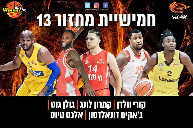 לצידו בחמישייה: גולן גוט שקלע שיא עונתי של 19 נקודות והוביל את עירוני "חי מוטורס" נס ציונה במדד הפלוס-מינוס נגד הפועל גלבוע/גליל; קמרון לונג שקלע 8 מ-17 נקודותיו במאני טיים ועזר למכבי ראשל"צ להתגבר על הפועל "בנק יהב" ירושלים; ג'אקים דונאלדסון שחגג בצבע עם 14 נקודות, 20 ריבאונדים ומדד 30 בדרך לניצחון חוץ של הפועל באר שבע/בני שמעון על הפועל "SP מצר" ת"א; ואלכס טיוס שקלע 14 נקודות ללא החטאה וסיים במדד 25 ופלוס-מינוס 22+ עבור מכבי "FOX" ת"א, שעצרה את רצף הניצחונות של הפועל "מול הים" אילת.