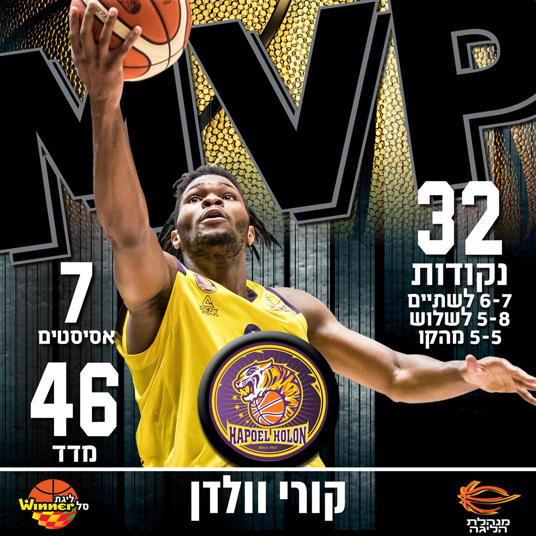 וולדן שבר שוב את שיא הקריירה שלו בליגה והציב אותו על 32 נקודות – אחת יותר משיא הקליעה הקודם שלו במדי מחזיקת הגביע, נגד אולדנבורג בליגת האלופות בעונה שעברה. הרכז האמריקאי הוסיף גם 7 אסיסטים והיה אחראי ליותר ממחצית מהנקודות של הסגולים בניצחון החוץ על הפועל "מול הים" אילת, כשהוא קולע באחוזים אדירים: 6 מ-7 לשתיים, 5 מ-8 לשלוש ו-5 מ-5 מושלם מהקו. הוא נח במהלך המשחק לשלוש דקות בלבד וסיים עם מדד 46 – שיא ליגה עונתי ושיא אישי.