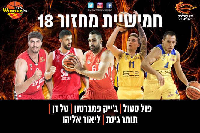 לצידו בחמישייה: חברו לקבוצה פול סטול שלהט עם 24 נקודות, 7 מ-10 לשלוש, 10 אסיסטים ו-5 חטיפות; טל דן שהוביל את עירוני "חי מוטורס" נס ציונה עם 16 נקודות (80% מהשדה), 9 אסיסטים ומדד 26 נגד הפועל באר שבע/בני שמעון; תומר גינת שהחל את הקאמבק של הפועל "SP מצר" ת"א נגד מכבי ראשל"צ עם 16 נקודות ו-4 חטיפות; וליאור אליהו שהמשיך את המומנטום מגביע המדינה עם 15 נקודות (7-8 מהשדה) ומדד 19 עבור הפועל "בנק יהב" ירושלים נגד הפועל "מול הים" אילת.