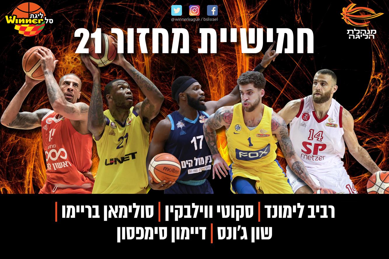 לצידו בחמישייה: רביב לימונד שקלע 11 נקודות, מסר 9 אסיסטים מול איבוד בודד ודורג ראשון בהפועל "SP מצר" ת"א במדד (22) ופלוס-מינוס (20+) מול עירוני נהריה; סקוטי ווילבקין שכיכב בניצחון החוץ של מכבי "FOX" ת"א על הפועל "בנק יהב" ירושלים עם 18 שלשות ו-5 מ-7 לשלוש; סולימאן בריימו ששוב הרשים עם 22 נקודות ומדד 33 בניצחון המשכנע של הפועל "מול הים" אילת על הפועל גלבוע/גליל; ודיימון סימפסון שעזר למכבי ראשל"צ להכניע את בני "רב-בריח" הרצליה עם 16 נקודות ו-12 ריבאונדים.