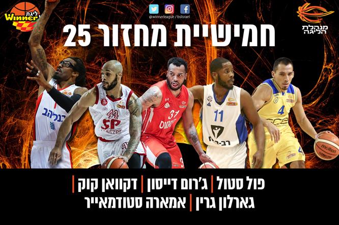לצידו בחמישייה: פול סטול שסידר למכבי אשדוד/באר טוביה ניצחון ראשון העונה על הפועל באר שבע/בני שמעון עם 22 נקודות, 7 ריבאונדים ו-10 אסיסטים; ג'רום דייסון שעזר לבני "רב-בריח" הרצליה לעלות מעל הקו האדום עם 24 נקודות, 7 ריבאונדים, 7 אסיסטים ומדד 31 נגד מכבי ראשל"צ; גארלון גרין שהוביל את הפועל "SP מצר" ת"א לניצחון חוץ חשוב על גלבוע/גליל עם 18 נקודות ו-7 ריבאונדים; ואמארה סטודמאייר שניצח עם הפועל "בנק יהב" ירושלים את מכבי "FOX" ת"א במשחק השיא שלו העונה: 22 נקודות, 7 ריבאונדים ופלוס-מינוס 14+.