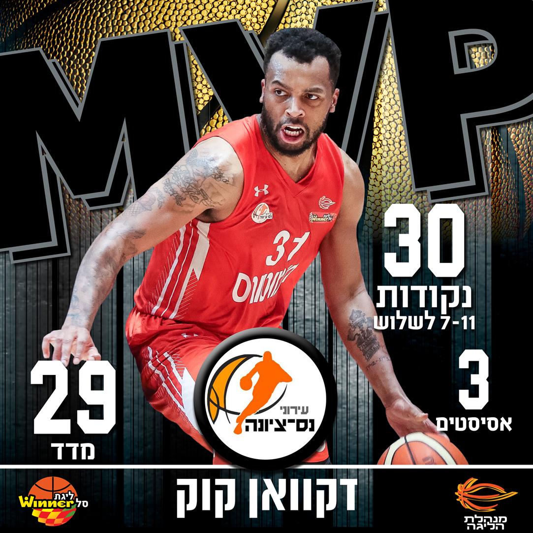 הפורוורד הוותיק קלע 21 מ-46 הנקודות של קבוצתו במחצית הראשונה בתצוגה אישית פנטסטית וגם אחרי קאמבק של המוליכה, עזר לכתומים לברוח שוב לפער דו-ספרתי ברבע השלישי. עד לסיום הוא השווה את שיא הקריירה שלו בישראל עם 30 נקודות (7 מ-11 לשלוש, 4 מ-7 לשתיים) ובנוסף מסר 3 אסיסטים בלי אף איבוד כדור. הניצחון העלה את נס ציונה למקום החמישי בטבלה והיא תוכל לעשות עוד צעד גדול לעבר הפלייאוף אם תנצח את השכנה מכבי ראשל"צ השבוע.