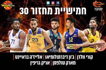 לצידו בחמישייה: קורי וולדן שקלע 14 מ-27 נקודותיו ברבע האחרון, בו מחקה הפועל "יונט" חולון פיגור דו-ספרתי מול בני "רב-בריח" הרצליה; ג'ון דיברתולומיאו שמסר שיא קריירה של 10 אסיסטים בלי אף איבוד כדור ועזר למכבי "FOX" ת"א להתגבר על מכבי ראשל"צ; אלייז'ה בראיינט היעיל שרשם 20 נקודות ומדד 22 בדרבי של הדרום בין הפועל "מול הים" אילת להפועל באר שבע/בני שמעון; ואריק גריפין שלא נח בניצחון החשוב של עירוני נהריה על הפועל "SP מצר" ת"א, אותו סיים עם 13 נקודות, 10 ריבאונדים ו-5 חסימות.
