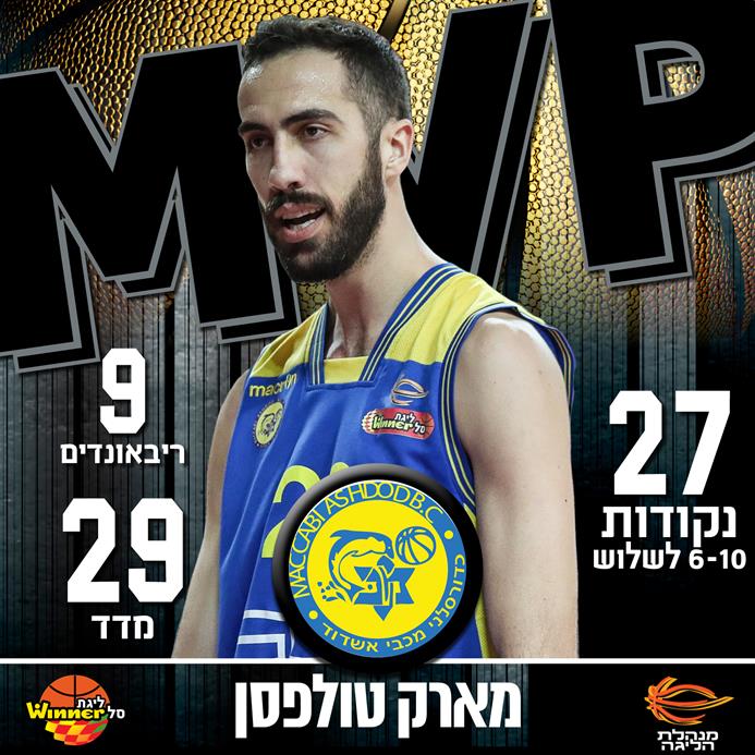 רגע לפני שחלום הפלייאוף נגוז, מכבי אשדוד/באר טוביה חזרה לחיים השבוע עם ניצחון חוץ גדול בלב המושבה שהשכיח את שני ההפסדים הקשים מול יריבות ישירות על המקום בפלייאוף. מארק טולפסן הוביל את "הדולפינים" לסוויפ עונתי על עירוני "חי מוטורס" נס ציונה ואחרי שלוש בחירות לחמישיית המחזור, הוא זוכה לראשונה בתואר ה-MVP השבועי.