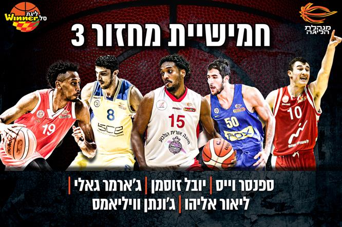 לצידו בחמישייה: ספנסר וייס שסירב להרים ידיים והוביל קאמבק מאוחר של הפועל "אלטשולר שחם" באר שבע מול הפועל "יוסי אברהמי" אילת עם 13 מ-15 האחרונות של האדומים, בדרך ל-21 נקודות (5-8 לשלוש), 9 אסיסטים, 4 חטיפות ומדד 33 במשחק כולו; יובל זוסמן שמיעט לטעות בניצחון החוץ של מכבי "FOX" ת"א מול עירוני "חי מוטורס" נס ציונה עם 11 נקודות (5-6 מהשדה), 7 ריבאונדים ו-6 אסיסטים ללא איבוד; ג'ארמר גאלי שקטע להפועל גלבוע/גליל בצורת של חמש שנים בלי ניצחון בית על הפועל "יונט" חולון עם 19 נקודות ומדד 21; וג'ונתן וויליאמס שהעלה את מכבי ראשל"צ למאזן חיובי עם 16 נקודות ו-18 ריבאונדים נגד מכבי חיפה.