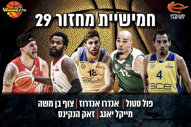 לצידו בחמישייה: פול סטול (26 נקודות, 6 מ-17 לשלוש ו-12 אסיסטים) וצוף בן משה (שיאי קריירה של 23 נקודות, 6 מ-7 לשלוש, 10 ריבאונדים ומדד 29) שהובילו את מכבי אשדוד לניצחונה הראשון מאז חידוש הליגה, לאחר הארכה נגד הפועל "SP מצר" ת"א; מייקל יאנג שקלע שיא עונתי של 30 נקודות והוריד 11 ריבאונדים מול עירוני "חי מוטורס" נס ציונה, בדרך לניצחון השביעי של הפועל גלבוע/גליל; וזאק הנקינס שכיכב בניצחון השני ברציפות של מכבי ראשל"צ על מכבי "FOX" ת"א עם 18 נקודות, 6 ריבאונדים ופלוס-מינוס 17+.