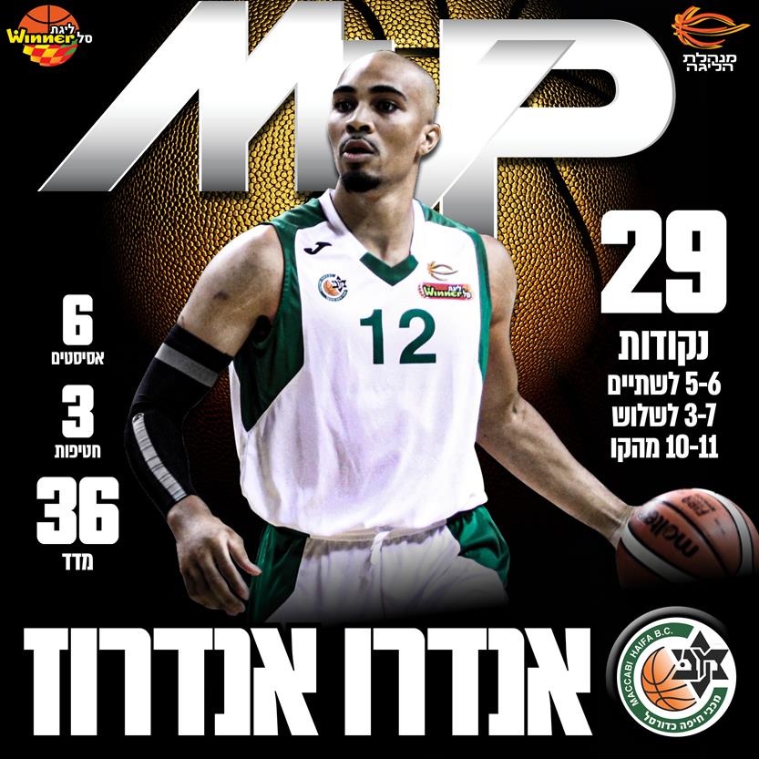 אחרי שבשלושת משחקיו הקודמים נעצר אנדרוז על 22 נקודות במצטבר, בקונכיה היו לו כבר 29 נקודות (5-6 לשתיים, 3-7 לשלוש, 10-11 מהקו), 16 מהן ברבע שלישי מדהים בו שינה את מהלך המשחק. הגארד ששיחק לפני שנה בהפועל עפולה גם מסר 6 אסיסטים, חטף 3 כדורים וסחט לא פחות מ-12 עבירות בדרך למדד 36. הוא נח לדקה אחת בלבד ועדיין הגיע מספיק חד וטרי למאני טיים כדי להכריע את המשחק עם שלוש קליעות עונשין.