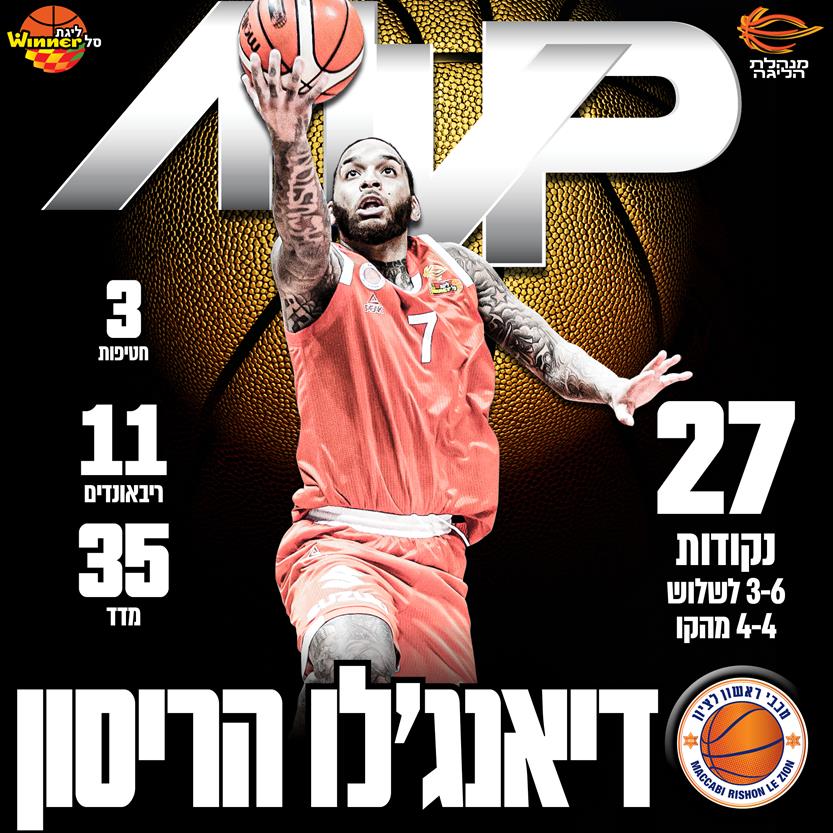 דיאנג'לו הריסון קלע שיא עונה של 27 נקודות לצד שיא קריירה של 11 ריבאונדים בניצחון הבית של מכבי ראשל"צ. לצידו בחמישייה: זוסמן, שאבון קולמן, מונרו ובריימו